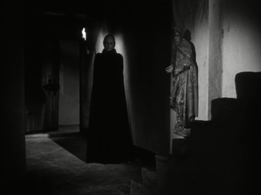 The Seventh Seal has one of the most famous opening scenes of all time, but after sixty years and more it still feels brazen, almost cocksure. Block walks into the water and splashes his face, his neck. He tries to pray, but cannot. It appears to be a lazy moment for him and for Jons, who are stretched out on the rocky beach. Later in the movie, characters like Skat will actively hide from perceived threats, but the crusaders are sure of themselves. Perhaps this is why Death appears to Block to tell him that he’s come for the knight’s life? There’s never a reason why Death appears to any of these men and women, which is obviously the point, but it’s a moment that reinforces a supposition I’ve had for a long time. (I expect you even share it with me.) Things go badly not just when things are getting good—for this is merely regression to the mean—but when you begin to think there’s nothing to worry about. Sleepy and dazed and nearing home for the first time in a decade, the Knight believes that his troubles are ending. Only the appearance of Death can shake him up, and only a game of chess which seems to pique Death’s interest keeps him from going right on the spot. The scene is fascinating; the image of a shrouded concept and a medieval knight playing chess on a rocky beach is indelible. And yet Bergman gambles his entire stack of chips on the first hand. If this scene doesn’t work, then the rest of this thoughtful movie is more farce than anything else. But it does work. Part of it is the light, which appears to be neither night nor day. Part of it is Bengt Ekerot, who can leer and smirk without being funny at all. Part of it is camerawork, which closes in on Ekerot’s outstretched cape as it nears its target. A disproportionate part is sound design, for the “silence in Heaven” that is referred to in the voiceover from Revelation foreshadows the silence of the waves when Death appears. And part of it is must be von Sydow, who reflects his director’s confidence as the specter and the man sit down at the board.