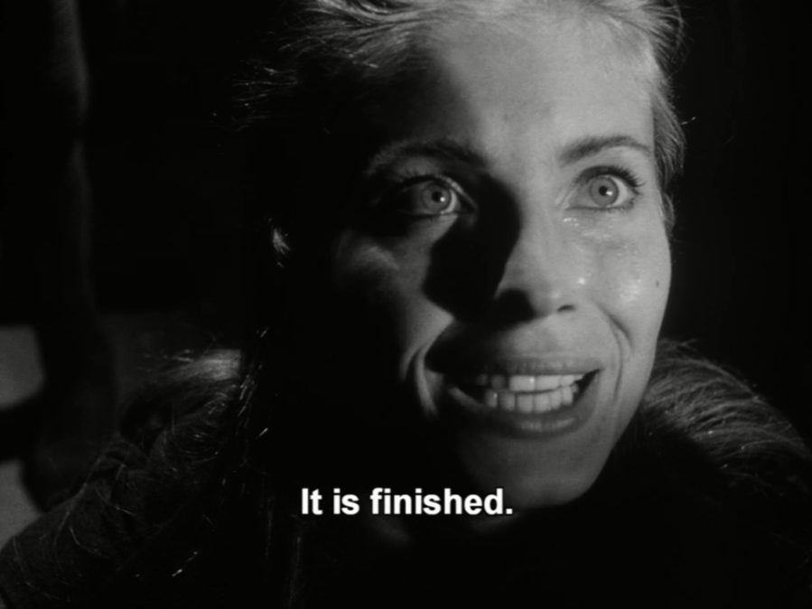 It’s not a terribly satisfying answer, but it’s the pretty good for The Seventh Seal. It certainly feels like a far better answer than the one found by Raval (Bertil Anderberg), the trainee priest who turned to thievery in the wake of the plague, or the Witch (Maud Hansson), which is out-and-out fear. Raval dies screeching and writhing; the young woman looks like she might scare herself to death before her ladder is to fall on the flames. It is also superior to similar tactics employed by Skat (Erik Strandmark), the libidinous actor. When he crawls up in a tree to get what he thinks is some safe sleep, Death comes along with a saw to chop down the tree. Aren’t there any exceptions or loopholes? he asks. ‘Fraid not, Death replies, and the tree falls. Of the cast we meet in The Seventh Seal (and with more than fifteen named characters in less than one hundred minutes of film time, this is one of Bergman’s most peopled movies), the most compelling and most humble method of meeting Death belongs to a seeming mute (Gunnel Lindblom), whose eyes widen more than anyone else’s and who falls to her knees as he approaches. “It is finished,” she says clearly. Perhaps it’s less bold than the ideology of Block and Jons, but there’s a profundity in the girl’s wisdom which is reminiscent primarily of the Serenity Prayer: “God, grant me the serenity to accept the things I cannot change…”