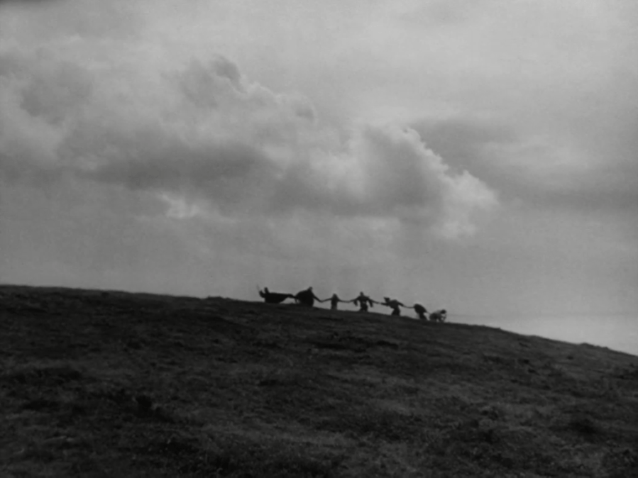 In that way, everyone in The Seventh Seal must envy Jof (Nils Poppe) above all others, for he can see what other men cannot. What brings The Seventh Seal above the level of Smiles of a Summer Night and The Magician for me is the way that Bergman manages to hit on what to do with his comic underlings. The little people of Smiles of a Summer Night, excepting Harriet Andersson’s Petra, fail to shine through. The Magician never does manage to wrangle its huge number of servants and bureaucrats into a story that only has four important characters. But The Seventh Seal carves out enough time for little people like Plog (Ake Friedell) and his buxom wife, Lisa (Inga Gill), who have a fairly hilarious tiff with Skat via some cues from Jons; it turns Jons’ vengeance against Raval or Block’s pity for the young witch into ways to develop its conflicting protagonists. But more than anything else, it makes Jof, who is a funny character, into an essential piece of the story. Our first interaction with him shows how he can see divinely; we do not even have to take his word for it that he saw the Virgin Mary teaching the infant Christ how to walk, for the camera depicts such a scene for us. From then on, we come to trust the juggler and acrobat. Other Bergman movies will suppose that certain individuals are granted this second sight; it’s at the heart of Through a Glass Darkly and it helps to resolve Fanny and Alexander. No image, however, burns into the mind quite so brightly as the image that Jof sees at the end of the film. With wonder, he describes to his wife, Mia (Bibi Andersson) how he can see Death marching his little group of departed in the dance. He has sight, but perhaps not understanding; he gives no sign of recognition that Block threw himself on the sword to save the charming little family from Death’s long reach. Jof is a simple man, and alone among a group of philosophizers he does not attempt to reconcile what he sees with a reason why.