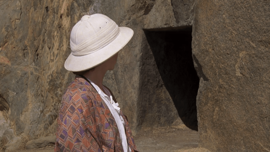 What Godbole is, really, is a giant shrieking siren for the orientalism that A Passage to India uses as its engine for 163 minutes. India changes people, Mrs. Moore (Ashcroft) tells her young companion, Adela (Davis), and just ugh. What it turns out to do is make a nice girl from England susceptible to the marvel of sex, which she appears to learn about from some ancient statues and then hallucinates grandly in the remote Marabar Caves. The caves are liable to create remarkable echoes, ones that no white person in this film can stand. Mrs. Moore enters one of them, is leveled by the noise and her claustrophobia, and declines to enter another. Adela, in the darkness, hearing the echoes of her own name, unsure of her engagement to Ronny (Nigel Havers) and her attraction to Aziz (Banerjee), loses her mind. She sprints at speed down the mountain, triggering a tiny avalanche and picking up scores of cactus spines on the way. Mystically, Mrs. Moore can feel that something’s gone wrong. The overall effect of this key thematic idea, that a young Western woman in repressive times cannot take control over her sexuality because of the esoteric Eastern surroundings, is to make orientalism the primary failure of A Passage to India. In film this may be the most textbook example of this sexual orientalism since Lost Horizon.