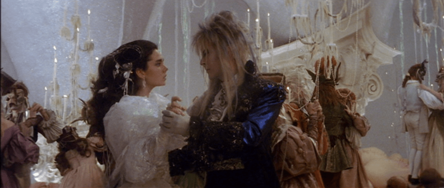 That the Goblin King should be David Bowie, and that David Bowie becomes the primary teaching tool in her psychosexual development, is equal parts brilliant and surprisingly fitting. In one of the movie’s loveliest scenes, and certainly its most unusual, Sarah is reimagined as girl in adventurous makeup, with her hair in full ’80s hairspray, wearing a puffy white dress, wandering in a masquerade of Jareth’s own imagining. The two of them dance. It’s not a sexy scene, thank heavens, but it is dripping with subtext. After having eaten a rather Prufrockian peach, she imagines a prom, a grown-up party, a wedding. The peach has made her lose track of her memories, but perhaps this is because she is seeing a future that can hardly be reminisced. In this future, the world all around her is masked, sometimes in costumes nearly as grotesque as the look of the goblins, but instead of repulsion there is mystery, romance. Any one of the people dancing around her might hold enormous promise for her just as the labyrinth has hidden its great threats. What surrounds Sarah and Jareth is nothing less than the crystal that he juggled so smoothly (and hilariously) when first they met: it is the promise of the dream itself, perpetually hidden while intoxicatingly near to interpretation; this is fantasy itself. At the end of the film, after she has come to her senses and rescued her brother, the many characters from the labyrinth appear in her room and join into a much less stately dance party. Sarah has grown up quite a bit, but, the movie says, there’s no harm in indulging in a little fantasy every now and then.