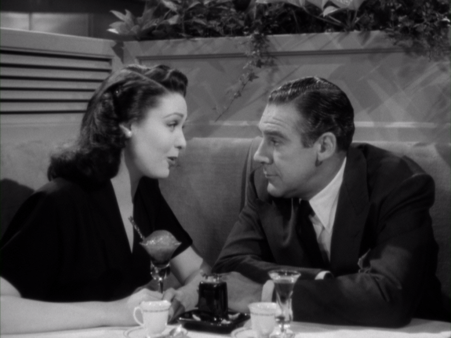 What really shines through in A Letter to Three Wives is as clear a statement as you’ll find about suburban femininity before the Second Wave; the hooks in Deborah, Rita, and Lora Mae are still in women of their station today. Addie is, by her absence from the screen, transformed into an ideal of womanhood. Lora Mae notes that Addie Ross is beautiful when she sees a photograph of her on Porter’s piano. She is single, but that’s because her husband, universally recognized as a heel, left her years ago. She is cultured and tasteful; the word “class” is bandied about her again and again. Worse still: each of the men in the story is somehow tied to her. Brad (Jeffrey Lynn) was the odds-on favorite to marry her before the war came and he met Deborah. (On the day that the wives get their letter, Deborah has a quarrel with Brad about a dress George gets a birthday present from her (while Rita, bound up with her dinner party with the boss, forgets that it’s George’s birthday entirely): it’s a symphony of Brahms, perfect for the professorial schoolmaster, with a note attached reading, “If music be the food of love, play on.” And Porter sees her as nothing less than a feminine ideal, although his low self-esteem makes it impossible for him to believe that he might ever really receive such attention from her.
