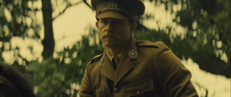 Would it be a movie about fin-de-siécle Englishman without a stag hunt? It’s how The Lost City of Z begins, showing us how Percy Fawcett (Hunnam) is not like the other men. The other military men going on this hunt are not his equals in horsemanship. Several of them go down hard as they ride in pursuit of the stag, but Fawcett leaps over stone walls and pushes his horse on faster than the others can go. It appears that the strategy for most of the others is to use their numerical superiority to envelop the stag and then share the kill. Fawcett is not interested; by the time the deer is down and he kneeling in front of it, the other men are only just riding up. He is the kind of man who goes it alone, if necessary, driven by his ambition, and powerfully decisive. The only encumbrances he is willing to accept are his wife and child, who he returns to immediately after the hunt.