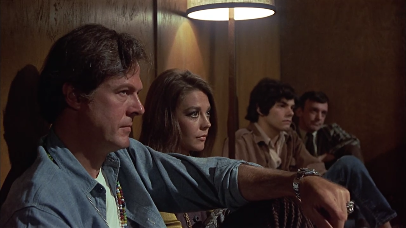 Bob & Carol & Ted & Alice has the more interesting premise of the two. A skeptical director, Bob (Robert Culp) goes to “the Institute,” a thinly coded Esalen stand-in, to do some research for a documentary. He has a surprisingly good experience there, though, struck by the openness of the other folks and moved by the encouragement of others to be in touch with his own feelings. Bob and his wife Carol (Wood) come to a new understanding with each other there, have a big group hug, and then return to L.A. to bring their evangel to their best friends, Ted (Gould) and Alice (Cannon). Over time, the Sanders wear down the Hendersons. Bob sleeps with a much younger woman, but Carol, who more than anyone else views the Institute as the source of a new lease on life, forgives her husband immediately; after all, he does not love that girl. Alice and Ted are horrified and slightly horrified, respectively, when Carol tells them about how Bob slept with someone else. Of the bunch, Alice is the most repressed, so far as these things go, and she takes the longest to adjust to the way that her friends—and her husband—have started to “liberate” themselves from Squaresville. Bob and Carol are more plot points than people, maybe because Culp and Wood are both a dash stony. Elliott Gould is the best part of this movie by a lot, the only quarter of this foursome that really lives up to the satirical promise of the film. He tokes a little and dances like a windmill in a tornado. He is inspired by Bob’s extramarital dalliance, as I suppose men of a certain age are. Bob & Carol etc. lands its strongest punch in a scene where Bob encourages Ted to let go of his guilt about adultery. You feel guilty when you want to cheat and don’t, Bob says, and you feel guilty if you do cheat. Why take the guilt without any of the pleasure? (This is significantly less interesting than the similar Mad Men thesis of “Why would you deny yourself something you want?” The Mad Men thesis would itself be less interesting if Don had said it.) On a trip to Miami, Ted sizes up a young woman in the row across from him for the same purpose, has a sex dream about her, and makes contact coming off the plane. It falls flat despite its importance to the movie; the pod person has successfully snared another victim, but there’s no sense of loss to accompany that moment because of the inevitability of Ted’s conversion.