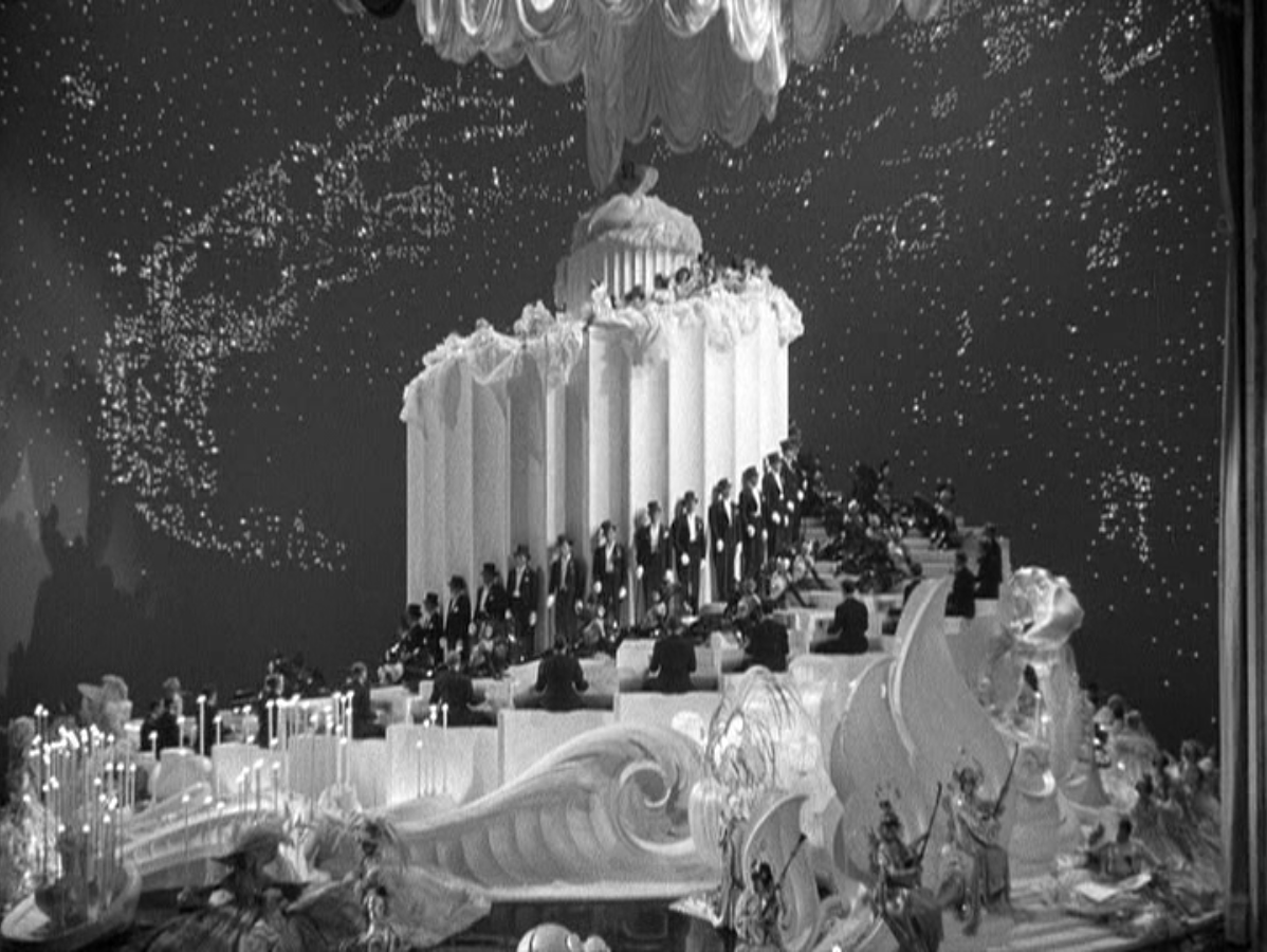 I’ve been down on the idea of movies as escapism ever since I read The Glass Menagerie in high school and came across the line, “People go to the movies instead of moving.” Aside from that, there’s a very bourgeois implication to the idea, especially in the way that the people use the movies to escape often have relatively small problems to escape from. But in the middle of the Great Depression I can see how The Great Ziegfeld is glorious, maybe even unprecedented filmic escapism. Adrian really got let out of the box for this movie, and some of its enormous sets have a pre-Dr. Seuss lunacy to them. Song after song, dance after dance, William Powell after Myrna Loy after Luise Rainer: rarely have the movies been more glamorous than they are here. Nor is it an accident that Florenz Ziegfeld is the center of this giant rotating wedding cake of a picture, as few people so thoroughly symbolize pre-Depression excess and excitement. (Call it the Avatar of the ’30s.) Unfortunately for the movie, it is as empty as a meringue. William Powell was never the actor one entrusted with psychological depth, for one thing; for another, there’s so much going on that one is reminded of poor Emperor Joseph in Amadeus at the end of three hours: “There are in fact only so many notes the ear can hear in the course of an evening.” The Great Ziegfeld is certainly hemmed in by its own premise, for to recreate scenes from the life of the glittering man and his life’s work the film must go big. Yet in so doing—and with a production budget the size of the Ritz—the movie infuses the performances with the same kind of limpid melodrama. There’s not enough counterpoint in the movie to make it work.