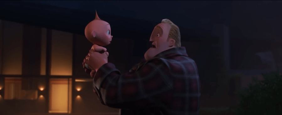 While Helen is putting on the ol’ super-suit and going by Elastigirl again, Bob is managing the lives of his kids and waiting his turn for something exciting to happen for him. (I don’t care if it’s already cliche to call this the “full Force Awakens,” because it is.) I was terrified that the movie would turn into a “haw haw look at that man try to parent by himself, haw haw” story, which is just a low, ugly form of humor. For a minute it veers dangerously towards that track, although in the end it turns out that the real problem is raising an infant who can phase through solid objects and fight raccoons in the yard. Bob accidentally has Violet’s would-be boyfriend’s memory wiped after he sees her in her supersuit without her mask, a problem which gives the newly confident Violet a sharp relapse into that mid-2000s emo anger thing she had going on. After a frizzy-haired Violet tries to put her suit down the disposal and then storms upstairs gnashing her teeth, Dash asks, “Is she having adolescence?” Yes, Virginia. Dash has math homework which is giving him trouble, opening up the first joke at the expense of Common Core that I can remember in a movie. I can do math! Bob says. They just changed it since I was in school! Eventually, Bob stays up late to figure out the new math and manages to teach it to his son before he goes off to school. Bob also tries to make things right with Violet, down to taking her to the restaurant that Tony’s family owns so she can reintroduce herself. (There’s a sight gag here that I am begging the universe to turn into a meme yesterday and which I won’t ruin for you if you haven’t seen it yet.) In the end Bob does okay by his two older kids…it’s just Jack-Jack who poses the problem, as he is showcasing his powers for the first time and there are more of them every time Bob turns around.