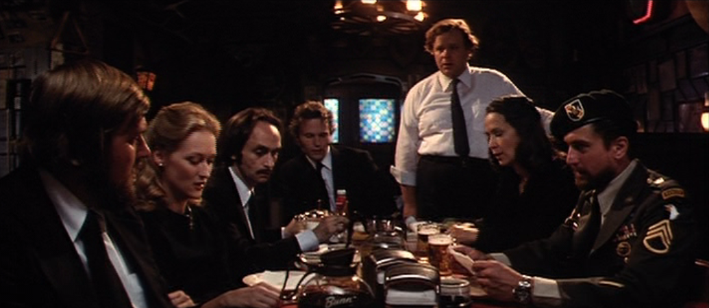 There may not be a pair of Best Picture competitors linked as tightly at the hip as The Deer Hunter and Coming Home. (At this point I have written about Coming Home in two places on this blog and The Deer Hunter in one, and only once have I failed to connect the two. Maybe I’m overstating the point, but there’s a reason Vanity Fair published Peter Biskind’s lengthy behind-the-scenes article about the lead-up to the 51st Academy Awards, “The Vietnam Oscars.”) Perhaps they are better understood as different sides of the same coin. Call heads, and The Deer Hunter asks what the fighting in the Vietnam War has done to Americans. Call tails, and Coming Home asks what Americans can learn from the failure of the Vietnam War. The Deer Hunter is, between the two, certainly the more myopic. The portrayal of the Vietnamese like a destruction of hornets, sadistic and swarming and willing to strike far from the nest. Writer Deric Washburn and director Michael Cimino—I’m talking about both because there ain’t much agreement on who’s more responsible for it—take a leaf out of the book that writer John Huston and director Frank Capra printed in Know Your Enemy: Japan. Perhaps it was more meaningful while people knew folks like Steven or Nick or Mike—or Linda, for that matter—and felt that something had been done to them. What the movie never adequately gets its head around is that Steven and Nick and Mike and those like them gave back what they got. The Deer Hunter is a more beautifully made movie, more cinematic, than Coming Home, and in that sense Cimino and Hal Ashby live up to their directorial reputations. But Coming Home is more focused on what’s meaningful. The Deer Hunter, when it’s in Pennsylvania, is about as formidable as Coming Home is in California. The obvious issue is that The Deer Hunter leaves Pennsylvania and works very hard to make us react to scenes in Vietnam with horror. Forty years later, we do, but I don’t think it’s in the way that the filmmakers intended.