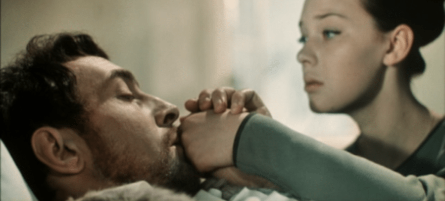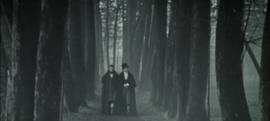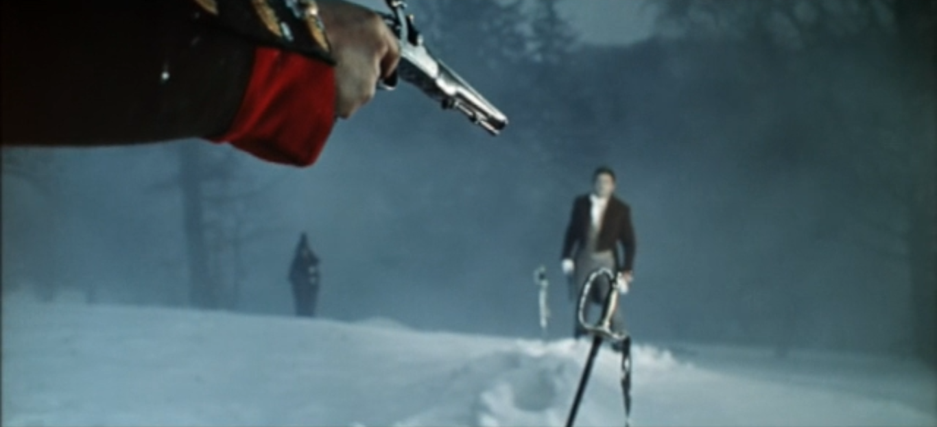 - …though there’s something to be said for beautifully said words if they aren’t onscreen. War and Peace, towards the end of its first chapter, has veered dangerously close to ponderous, grim, or even in these last ten minutes or so, a little too symbolic. Andrei has his oak to occupy him and his brush with death at Austerlitz where no less a man than Napoleon notes his gallantry. (Glory is easy enough to accomplish if one has a little courage, the movie seems to say, but with the banner in his hand as he is rudely propped up by a little crop of rocks, more than a little ways toward cadaver status, it’s awfully difficult to reap the benefits of.) Pierre, driven by aggravation he cannot suppress to demand satisfaction from Dolokhov (Oleg Yefremov). Dolokhov is already shtupping Pierre’s weirdly gotten wife, Helene (Irina Skobtseva), so it seems a little unnecessary for him to grab a menu out of Pierre’s hands and then refuse to give it back; like, how much more can you rub it in? The duel is shot stylishly, emphasizing the mystery of what will happen after an overexcited Pierre decides he’s, ah, not throwing away his shot. It’s a dramatic last push in “Andrei Bolkonsky,” in other words, until we hear Natasha’s voice rushing out over a moonlit lake. The passage from the book puts it like so:“You go to sleep, but I can’t,” said the first voice, coming nearer to the window. She was evidently leaning right out, for the rustle of her dress and even her breathing could be heard. Everything was stone-still, like the moon and its light and the shadows. Prince Andrew, too, dared not stir, for fear of betraying his unintentional presence.“Sonya! Sonya!” he again heard the first speaker. “Oh, how can you sleep? Only look how glorious it is! Ah, how glorious! Do wake up, Sonya!” she said almost with tears in her voice. “There never, never was such a lovely night before!”Sonya made some reluctant reply.“Do just come and see what a moon!… Oh, how lovely! Come here…. Darling, sweetheart, come here! There, you see? I feel like sitting down on my heels, putting my arms round my knees like this, straining tight, as tight as possible, and flying away! Like this….”The words are basically repurposed, and the thought itself—folding oneself into an entirely interior, fetal presence and flying away into the darkness—is fitting with the sadness and pessimism that Pierre and especially Andrei have experienced. It’s impossible not to connect Natasha’s dream with the death of Andrei’s wife in childbirth, not with the imagery she’s using. And yet it is expressed with such blissful hope that it is obviously infectious not just for us, but for Andrei as well.