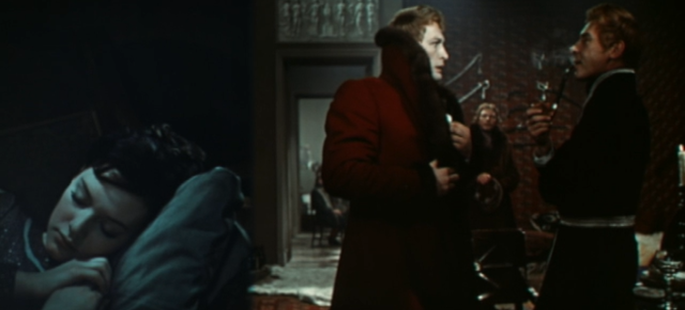 - After Natasha’s failed elopement, there are three scenes where Pierre has a chat with someone who’s not fully willing to have a chat with him. In the first, he commands Anatol (Vasili Lanovoy) to get out of Dodge and, after getting a hint from his brother-in-law, pays him off. In the second, he consults with Andrei and begs him to forgive Natasha. It’s a scene in which the old Andrei, the one who was withstanding his father’s abrupt farewells and the one who tearlessly stood by his wife while she died, has returned. It is a brilliant scene for Tikhonov—Bondarchuk, the actor-director, firmly understands when to zero in on the actor—who is never better in the film. Handsome, haughty, cold, his small, sharp nose does half the work for him. A man should forgive a fallen woman, but I cannot, he admits. In his eyes we see something of the pain he’s feeling; we are as close in on him as we get throughout the movie; he lowers his eyes once before looking back at Pierre, and Andrei’s ultimatum, that he will retract his friendship should Pierre press the issue, has acted as the armor her needed during that moment of vulnerability. The movie will give us glimpses later on of the nobility within Andrei’s character, but I think it’s fair to say that here is the “ecce homo” moment for Andrei Bolkonsky. For the majority of his life, he is this person, and that will not change except in extremis.
