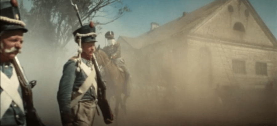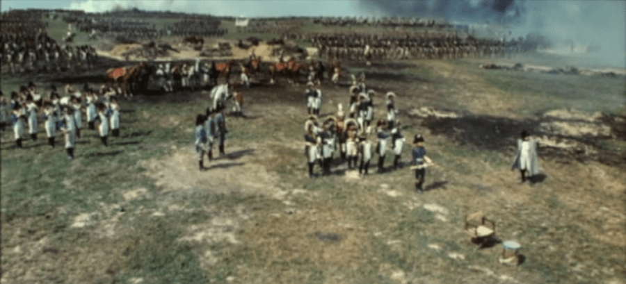 - It seems incredible that we’ve gotten this far only name-dropping Napoleon (Vladislav Strzhelchik, who honestly looks just like the guy), but then again he is not really a character unto himself until Borodino. He paces constantly, although now and again he’ll flag a little and sit in the special chair they’ve got arrayed for him. (That it looks like a director’s chair on a film set cannot be a coincidence, and it is one of the only funny things that happen in this entire movie.) His face is always hard. I don’t know Strzhelchik does it—perhaps there’s something to the way that he never assents to anything, that he always sees a problem in any suggestion even when someone’s trying to give him lunch—but he has the aura of genius which is necessary for any actor who is going to play Napoleon. There are two key scenes with Napoleon in “The Year 1812.” One shows his reluctance to commit more of his reinforcements despite two officers telling him that with another division they might be able to sweep the Russians from the field. (Historians have been critical of Napoleon’s withholding of some units which might have been able to do just that.) And at the end, narration sounds while we sweep over the field in helicopters and see still photographs of many Russian soldiers, saying triumphantly that for the first time Napoleon met a will greater than his own before the camera returns to the sky with the sort of photography we saw in the first few minutes of the movie.