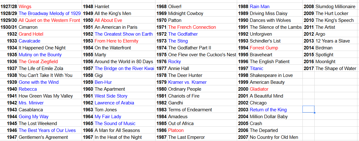 I love making ugly charts, so here’s an ugly chart of whether or not each Best Picture winner was arguably the most popular film of the year. I’m not relying just on box office numbers, which I have a feeling the Oscars won’t either; there’s a certain level of word-of-mouth, of good press, and of general “You have to see this” that I’m trying to account for as well. If it’s the top-grosser of the year, I’ve put it in blue; if it’s arguably the most popular movie of the year based on good reviews and high box office placement, I’ve put it in red. I apologize in advance if this is not 100% accurate, because movie grosses are notoriously tricky to calculate with 100% accuracy:
