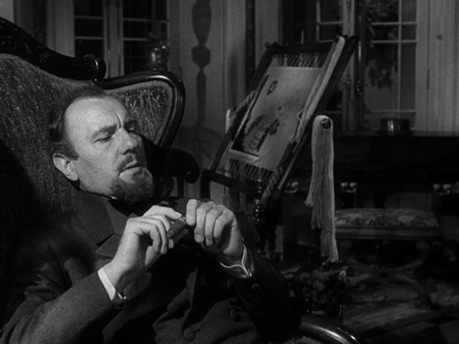 As a star vehicle, one can hardly refer to The Heiress as “joyous,” although it does feature some of Hollywood’s better actors arranged to perfection by William Wyler, who is unmatched as an arranger of dolls in his dollhouses. In The Heiress, frequently de Havilland but sometimes Richardson will be placed in the lower corners of the screen, making them feel unnaturally close to us while we watch. I have a particular fondness for this shot, which puts Richardson in the foreground and the embroidery in the background, like the ghost of his daughter’s dull virginity hanging on his shoulder like a meticulously planned Mephistopheles.