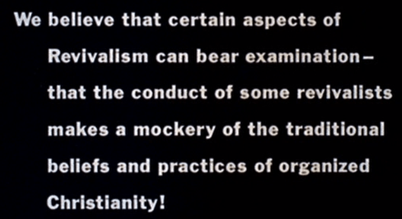 Each one ends with the exclamation point, and while I’d like to give the benefit of the doubt to the filmmakers, it was also 1960, which is not a year one frequently associates with sarcasm. To me it’s an opening representative of the limitations of a 1960 Elmer Gantry movie, which are significant. If it’s a barb aimed at the fundamentalists who would criticize the film for existing, then it’s too cheerful to sink in. If it’s a peace offering to those same people, then it’s somehow even stupider.