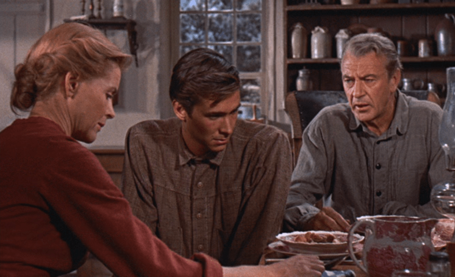 One walks away from Friendly Persuasion wishing that the film had been more serious about its characters’ beliefs. It has the seeds of a good movie in it, even an unusual one. Friendly Persuasion is episodic and tranquil in a way that mainstream American movies rarely are anymore. Would any studio keep the movie’s scenes of comic relief, in which Jess (Cooper) and Josh (Perkins) fight off the amorous singing of a widow woman and her three desperate daughters? (Watching Perkins squirm while three women nuzzle and caress him is what I think the universities call “subtext.”) There are long stretches of the movie which are pure agrarian verisimilitude, i.e. not much happens but everyone seems okay with it onscreen so we gamely follow behind. And for the most part, the people do appear happy enough. Jess and Eliza (McGuire) quarrel frequently, but they are minor squabbles which can be mended with an adequately romantic gesture on Jess’ part; or, perhaps, they require Jess to begin praying with such verve and volume that it drowns out the sounds of illicit music creaking down from the attic. The men are men, the women are women, they sit on separate sides of the church, the valleys stretch on forever through endless fields of corn, and somewhere even Norman Rockwell needs a minute to get his bearings. In Gary Cooper, whose amiably ironic performance anchors the film, there’s hardly a trace of the man who could be charmed by Dietrich in Morocco. Tom Brown, the Legionnaire who was titillated by one woman kissing another, has been replaced by the small farmer Jess Birdwell. Friendly Persuasion is the picture of a man who’s been married for twenty years and says cute things like, “Gosh, isn’t that swell!” and “Sorry, pal, I think I need to talk to the ol’ ball and chain first.”