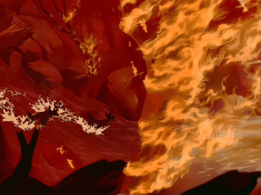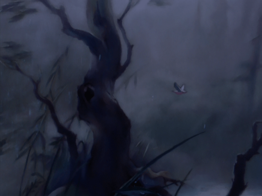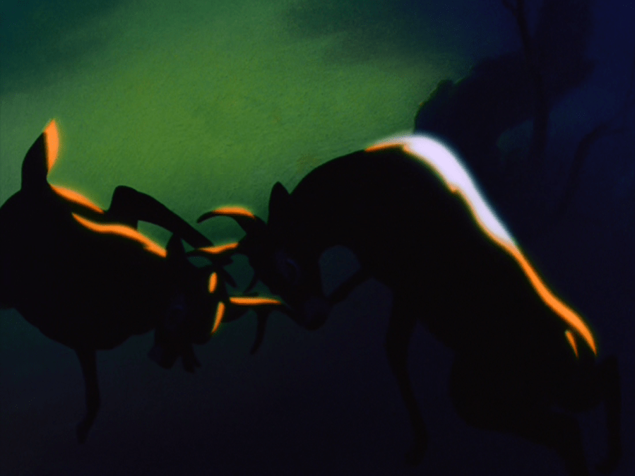 Yet it is not the gray light of Charles Foster Kane’s final happy moments in the snow, or the gray mist that falls upon Rick and Ilsa on their hill of beans, but a sudden storm that sneaks onto Bambi’s nose and falls on all the forest creatures alike. An opportunistic scurries under multiple coverings before ultimately choosing a little nest of grass. A partridge scurries alone with her young underneath her; a doofy chick in a nest high above feels a single drop and decides to take cover under his mother. (The ducks, of course, have a grand old time.) The river runs, the lightning crashes, and all of it occurs in muted green-gray tones only sometimes upended by the white light of thunderbolts.