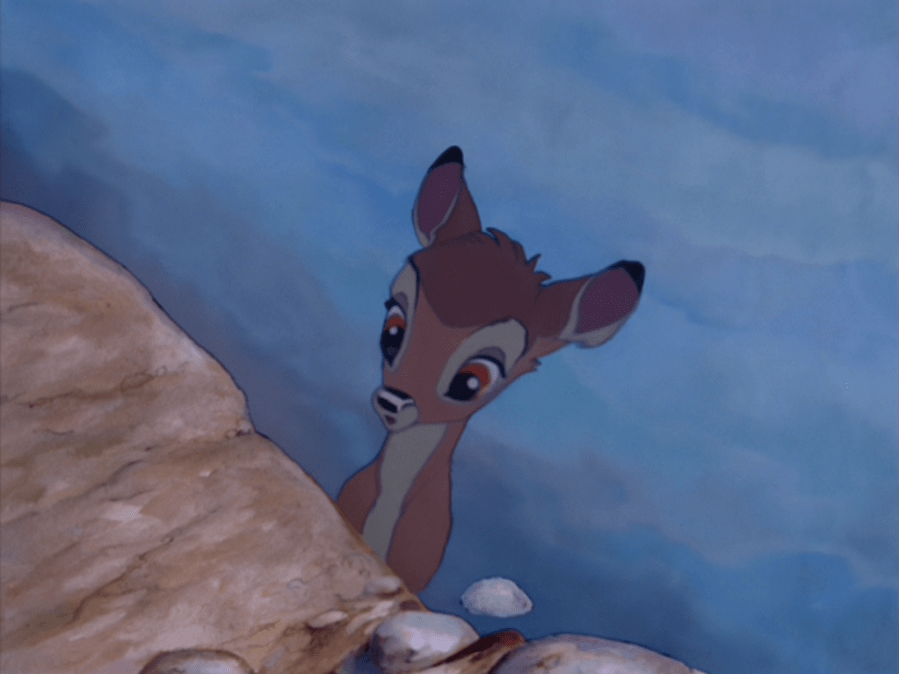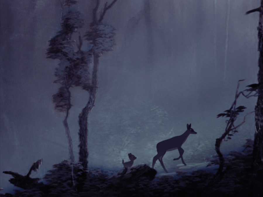 The 1940s, one of the great filmmaking decades in this country, is not noted particularly for its beauty. There certainly are beautiful movies in the ’40s, but most of the highlights are brainy or sexy or difficult before they are beautiful. The predominant style was noir, a word which translates literally as “black,” and the black-and-white pictures dominated the decade. Bambi is sandwiched between movies like Citizen Kane and The Maltese Falcon on one side and movies like Casablanca and Shadow of a Doubt on the other. Horror, despair, headlines, and desperation fill those movies with grit and cynicism. Somehow, Bambi exists in the middle, a film which above all else is sublimely beautiful. Sometimes that beauty is as gray as any moment from Citizen Kane: