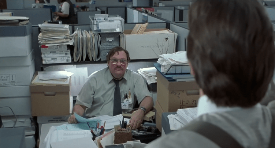 Nor does it help that Office Space is a drowsy movie. Stephen Root plays the movie’s most culty figure, Milton Waddams, who is a mumbling mess of a human being. It can’t have actually happened more than three times, but in practice the scene that he repeats over and over again with company vice-president Bill Lumbergh (Gary Cole) may still be happening. Lumbergh needs Waddams to move his desk or do some menial task. Waddams meeps at him while Lumbergh ignores him. It takes about the same amount of time every time. There’s a red stapler involved in this that’s probably a Horcrux or something. It’s the primary example of Judge finding a moment which is humorless but horoscope-level relatable, which is . (It’s also the key to the movie’s ending, which is as close as it gets to Roark-esque incendiaries.) The movie begins with a few, at that. On his way to work, Peter (Livingston) discovers that no matter what lane he’s in, the lane he was just in moves faster (DAE…?). He gets the business about not having read a memo from multiple bosses in sequence. Michael fights the copy machine. Someone says “case of the Mondays.”