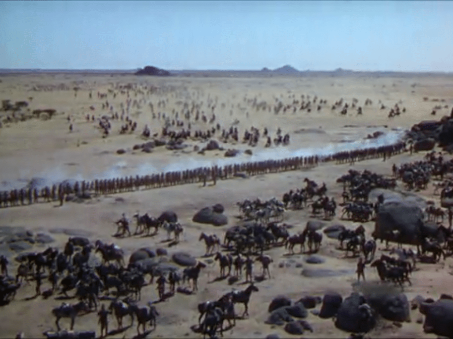 The shot above is the movie’s thesis. A storm of ferocious, enthusiastic cavalry troops charging en masse but not in formation, meets a disciplined enemy firing with superior weaponry from their thin red line. (Fear not: the British square was used earlier in the movie.) This is the difference between the British, the civilizers, the benevolent but firm parents, and their black and brown assailants, the hordes who can overwhelm the British with their superior numbers but will never know the value of fair play. The battle ends as a British victory, won on the battlefield by the force of arms and the coolness under fire and, as it turns out, a surprising assist from some prisoners in Omdurman who capture the armory. After a decade of disorder, the British put things right, and along the way a young man named Harry Faversham (Clements) learns some valuable lessons about self-sacrifice and courage. The comparisons to Gone with the Wind are inevitable, and watching the film almost eighty years on can be an equally queasy experience. To appear like a member of the disgraced Sangali tribe, Faversham must dye his skin a dark brown and wear a beard, but apparently he must also keep his head practically on his right shoulder and grunt and roll his eyes like he escaped from the asylum in Amadeus. One wonders if the Arab who cut down Chinese Gordon looked that silly as he did it.
