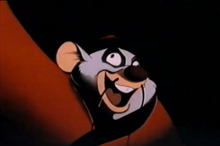 Where you place Basil of Baker Street among the protagonists of other Disney movies will dictate where you place The Great Mouse Detective among other Disney movies. For those who find our miniature Sherlock Holmes just another iteration of the character merely fine, this will seem awfully high. I think Basil’s moody brilliance is great, and thus this seems like a pretty good place for it. Few Disney movies put themselves so completely in the hands of a single character, preferring instead to rely on a villain’s malfeasance or a giant supporting cast. Basil is so many people in one that the movie still works well. From the first time we see him, there’s some level of mystery about him. “I shall have him!” a voice cries. A door bangs open. Lightning flashes. The same voice, more disturbed by the physical impediment of outsiders than curious about their presence, shouts, “Out of my way, out of my way!” A hat flies onto Dawson’s head and sticks there. Basil rips off his false head, deflates his costume, and immediately bounces into that Sherlockian energy that I suppose even the nerds who read the stories will recall. Nothing is beyond his notice and yet everything is just a little beneath his interest. He tells fortunes about Dawson’s profession and recent past; he fires a bullet into some cushions; he screams with disappointment when his evidence and his bullet do not match precisely. A violin. It’s all entirely characteristic, and it’s the same mixture of glee and despair that shows him in his best moments. When it appears that all hope is lost and that he has been caught and will be killed several different ways by his nemesis, Ratigan, Basil fairly gives up. Dawson already believes in his brilliant friend to save them, but if he refuses to do so, he says, “we may as well set the trap off now and be done with it.” Basil repeats the words, and then he starts to laugh. There’s a zoom his face, a cut back to Dawson, and then Basil’s wild eyes stare directly into the camera. “Yes! We’ll set the trap off now!” After a tense few moments, all is well; Basil has not even forgotten that this supposedly grisly moment is meant to be documented. Holding Olivia and holding up Dawson, he implores them to smile. He does. They don’t.