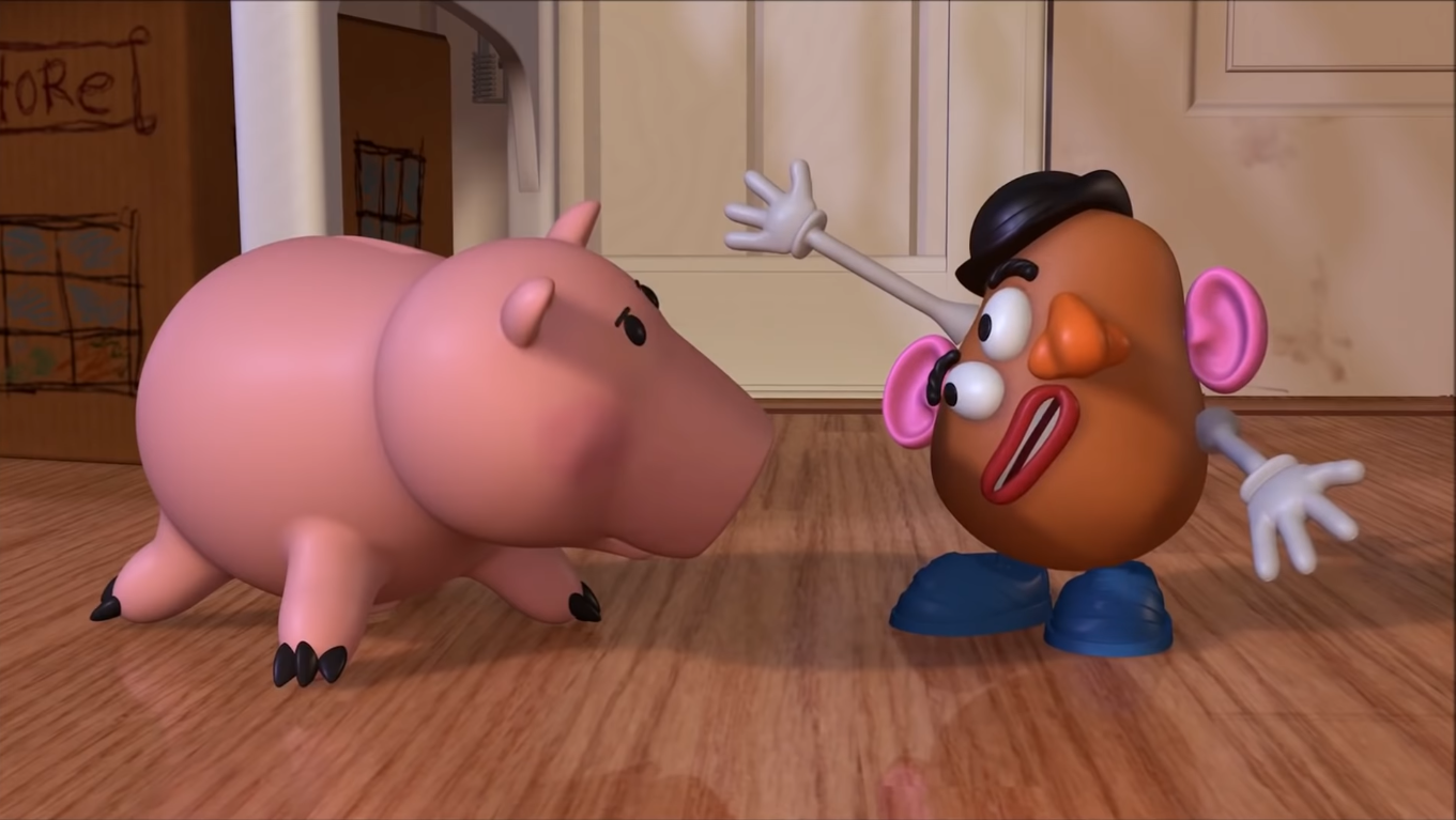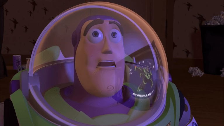 I suppose the reason Buzz has such trouble realizing he’s a toy is because he has batteries. Confident and the possessor of “more gadgets than a Swiss army knife,” Buzz’s crash landing on Andy’s bed sets off a wave of recriminations. Woody slides off the bed and appears from underneath it. Everyone knows that his spot is on the bed, and he is quickly given some guff from the likes of Potato Head about how he’s already being replaced by whatever this new toy is. One of the things that stands out about watching this movie for the zillionth time is how quickly everyone else comes to like Buzz. Maybe they’re impressed by his technological wizardry or his “ability” to “fly”—not everything about the old computer animation works, but the look of that sequence where Buzz falls with style for the benefit of the crowd holds up just fine, thanks—but it’s not lost on them that he is a challenger to Woody. During the “Strange Things” montage, it’s also clear that he’s a lot nicer to the other toys than Woody is. Woody sees himself knocked to the next step down in Andy’s heart, bedsheets and all, but the other toys find Buzz a more than welcome addition to the room. He’s less bossy than Woody. He doesn’t deign to talk to them or shy away from helping them out. When Rex tries to scare Woody with his roar, Woody patronizes the attempt. Buzz helps Rex let out a deep-voiced roar that blows the features off of Potato Head’s face. Woody treats Slinky like a flunky or gofer, even though the two appear to be something like best friends; Buzz gives Slinky one heck of a chin-scratch. (Good dog.) Buzz implements an exercise program; he combs a troll doll’s hair, for heaven’s sake. Buzz is certain that he has a mission to complete for Star Command, but he finds relevance among Andy’s toys by being there for them and by being “accepted into their culture,” when he shows them that Andy “has inscribed his name” on his foot. Things come to blows and open windows, and underneath a truck Buzz puts his finger on what Woody’s real problem is: “You are a sad, strange little man.”