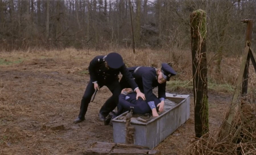 The camera is a vector, o my brothers, and what works most in A Clockwork Orange, a movie where Kubrick indulges in that electric train set as much as he ever did after 2001, is when that camera pulls away. The first two minutes of Clockwork Orange is lethally good, as simple as it gets: a camera at first homed in on Alex’s face falls back, receding from him and showing us more and more: his droogs, the ambience of the Korova Milk Bar, the unlikely collaboration of futuristic kitsch. All that we need to know about this near-future that Alex lives in, which, outside the world of himself and his teen friends is not so different from the 1970s anyway, is in that first shot which reveals more and more, every inch more unbelievable than the last one. In a career of great shots, surely that opener ranks towards the very top. Later on, in surprisingly effective slow-motion, the camera recedes from Alex and his droogs again as he walks with them and plans to chastise them for their attempts at usurpation. It takes more than thirty seconds of moving towards us in which it seems they’ve barely moved at all for Alex to lash out, although when he does it seems incredibly swift even in that slow-motion. The full extent of this group’s acrobatics are on display. McDowell’s lateral motion, the swing of his arm and the great right-angled lift of his leg into another’s body, are marvelous. Warren Clarke uses every bit of momentum he can to launch himself backwards twice: first, when Dim misses Alex with his chain and lands in the water, and second, when he watches Alex cut his wrist open with a knife and then pushes himself back into the water again. James Marcus has the great pantomime of being hit in the stomach with Alex’s cane, as well as a spreadeagled headfirst dive into the water. There’s nothing complex about any of these shots, but it’s the framing of them, the patience to pull away or hold still, and the knowledge that motion within the frame is so often more powerful than motion of the camera itself.
