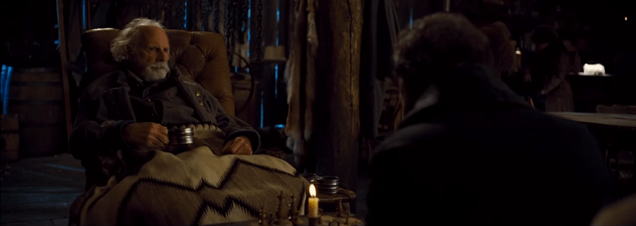 With all that said, it’s not as if the inside bits don’t work visually. Tarantino and Richardson do a really good job of making that cabin big enough for all those people wandering about inside, giving each of them the room to wander about and explore the space. It is big enough for Mobray (Tim Roth) to proclaim that one side of the cabin can be “Philadelphia” for those with Northern sympathies, and another can “Georgia” for former Confederates; more than that, it actually stays that way for a minute without the action feeling nearly as stilted as the dialogue. Deep focus is their friend, and ours too. When we get it, it’s meaningful because we want to see as many characters reacting to as much as possible, and this is a good group that reacts (or doesn’t) effectively. The best part of the film might be the running gag that it takes two pieces of wood nailed to the door to shut it; the first time it happens, we know Tim Roth is one voice because we can see him speaking, but the other voice comes from off-screen. It’s a clever moment, one that give us a hint that the cabin is more populated than it looks, and hey, the cabin certainly turns out to be more populated than it looks. There are moments when the lighting is a little too clever inside—there’s a spot in the cabin when Ruth observes the light falling from above in a way that makes me worried for the structural integrity of the building—but for the most part it is dark enough inside, and that’s what counts. It is the second-best part of the film, because without that specific brown-yellow-blue darkness in the cabin the movie would absolutely fall flat.