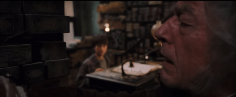 This is, like the majority of the Potter movies, over two and a half hours, and like a number of Potter movies its best scenes are in the early going. (Let it not be said too loudly, but the best parts of these stories were never the conclusions.) Aside from the obvious winners, like “You’re a wizard, Harry” and the Sorting Hat and Harry’s first ride on a broomstick, the movie is very much at home stepping aside and allowing its profoundly overqualified supporting actors to steal scenes. Alan Rickman’s Snape is swooping and fey; his classroom is singularly sepia colored, casting the students into darkness lit only a smidgen by the fires under their cauldrons. Later directors would decide that Snape’s settings were insufficiently dark; I get the impulse to go full dungeon, but I can’t help but think that this is more effective. It places Snape in the spotlight, billowing to and fro, sneering at Harry’s insufficient knowledge of magic chemistry, while Harry is stuck in this sad little shadow, towered over and chastened. John Hurt’s performance as Ollivander, whose shop is somehow much darker than Snape’s dungeon, is the most magnetic of the film. Rarely near to Harry, and absent from the alternately humorous and prophetic shots of Harry’s wand attempts, he is ethereal and strange, appearing from around corners and difficult to latch onto. It’s not until he tells Harry a horrifying truth about the wand that’s chosen him that we really get a sense of his presence, and then it lands wonderfully. In close-up, we can see the condemnation become awe become appreciation as Ollivander says that Voldemort’s accomplishments, though “Terrible!” were still “great.” Sorcerer’s Stone gets its single moment of gray in Ollivander’s apologetics, and that’s all on Hurt’s rasp and keen eye.