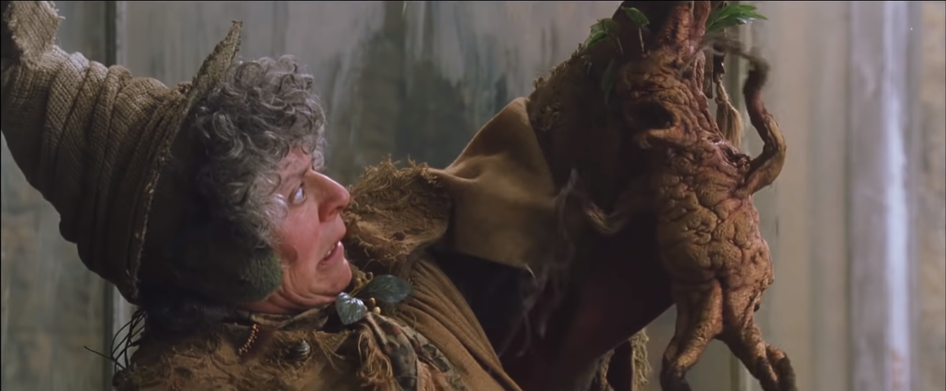 The great strength of Sorcerer’s Stone is that it leaned all the way into making us awestruck at the Wizarding World. The great failure of Chamber of Secrets is that it leaves aside that sense of discovery which came with its predecessor. For example, a smidgen of the time they spend with that little Ford Anglia might have been better spent on some other way to make the Wizarding World, rather than its one-offs and oddities, engrossing. One can practically hear the producers saying something like, “It’s going to be expensive to make the car fly, but we have the tech and the prop, so we want to see it” in much the same way that once your parents buy you a pricey toy for Christmas they expect you to play with it. The car, piloted by a troika of Weasleys, flies to rescue Harry (Radcliffe); the car dodges a train; the car door opens and Harry falls most of the way out; the car is the Keith David to the Whomping Willow’s Rowdy Roddy Piper; the car bursts into Aragog’s colony, picks up the boys, and bursts out over the course of minutes; the car returns to the Forbidden Forest, and long may it remain there. Here’s a movie with a few too many action setpieces, and the car is symbolic of that inclination. Or take the movie’s approach to Polyjuice Potion, which could hardly be detailed so much in the picture as it is in the novel, but even so it becomes just another tool, like a chisel, to try to figure out whether or not Malfoy (Tom Felton) might be Slytherin’s Heir. The movie checks off the stirring in the bathroom, Moaning Myrtle, etc., and it’s never given a chance to really catch our attention. Perhaps the closes the movie comes to giving us that something new is in a scene that probably does not need to be here at all. Professor Sprout (Miriam Margoyles) teaches a lesson about Mandrakes (“or Mandragora,” thank you, Hermione) which culminates with her pulling one of the ugly little suckers out of its pot and moving it into a bigger one. Everyone else does the same, triggering a great chorus of AYEEEAYEEEAYE as the Mandrakes all scream at once and their ugly little baby faces contort. It’s weird, and the scene is played for humor, and all in all it’s a successful one that makes us feel like we got a glimpse into something that the rest of the Muggles don’t know about.