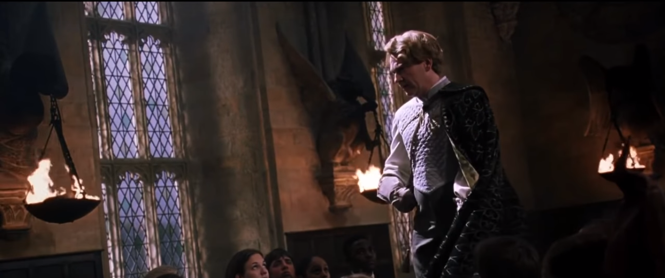 The biggest loss in terms of plot is probably Nearly Headless Nick’s (John Cleese) deathday party, and what matters about that in the end—that Harry is wandering around Hogwarts late and comes upon the petrified Mrs. Norris—is easily worked around. Probably a greater loss is the general culling of Gilderoy Lockhart (Kenneth Branagh), who is a wonderful comic character and whose iron grip on Harry’s life is unequalled by any teacher until Order of the Phoenix. Lockhart enters the picture at the center of a cult of personality, peopled by an almost entirely female coterie and funded by a series of alliterative bestsellers. He spies Harry at Flourish and Blott’s, announces that the two of them “rate the front page,” and proves his gift for holding sway in just about any setting. Lockhart weasels his way to the center of the fearmongering about the Heir of Slytherin by setting up and emceeing the school’s Dueling Club, wearing a cape and generally pushing Snape (Alan Rickman) to the absolute edge of his patience. He is the first on the scene when a rogue Bludger breaks Harry’s arm, and once there he fields off a “Not you!” from Harry en route to vanishing all the bones in that unfortunate arm. All the way through, Branagh plays Lockhart as a workout warrior, someone who has the physical ability and the confidence to dazzle but whose mind shrivels up in game action. In a series where even the adult actors frequently feel one-note, Branagh brings something resembling depth to this most shallow character. Lockhart is a coward, and everyone knows it, but he has just enough bravery in him to intervene on his own behalf. Forced into the Chamber of Secrets by Harry and Ron (Grint), protesting all the way, he quickly finds enough élan to snatch Ron’s wand, come up with a plan spoken in serious tones about how he’s going to maim the boys’ memories, and follow through as far as Ron’s wand will let him go. The scenes in this movie with Branagh are usually not much better than okay, but multiple sequences pale into invisibility without his color.