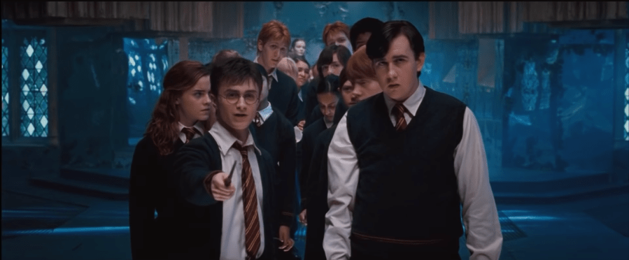 Cuaron’s blues are more meaningful than the artificial darkness of Yates’ picture. That Slawomir Idziak photographed Three Colors: Blue as well as this movie is a tragic sort of joke. The movie’s addiction to cool colors is trite, a sort of visual hint that what we’re seeing is edgier than the friendlier color palates of earlier pictures. Comparing Order of the Phoenix to Three Colors: Blue doesn’t do Order of the Phoenix any favors, but Kieslowski’s movie made blue into a mood, chose moments and objects and places to layer over Juliette Binoche. Order of the Phoenix uses blue and white as easily read symbolic accents instead. (It’s also short Binoche, who is arguably the greatest movie actress of all time, so that’s kind of a disadvantage.) Take a scene in the Room of Requirement where shining white Patronuses scamper around a room lit in robin’s egg blue. White is good, blue looks nice next to white and has positive connotations: instant mealy “good guys” lighting. Nor is blue the only color used badly in the production. There was a bathroom at my university which had walls of black tile which were notorious on campus and, incidentally, basically identical to the Ministry of Magic. Occasionally that darkness even works, as it does in the Department of Mysteries; that scene gives us as much of a visual feast as any in the movie, as midnight blue is not typically the color of reflective light in that darkness. All in all, though, the look of the movie is deeply simplistic. In searching for a theme, it falters: it is not bold enough to stand up to Idziak’s earlier work with Kieslowski in the ’80s and ’90s, let alone aggressive like ’70s Nykvist or prodding like ’10s Lubezski.