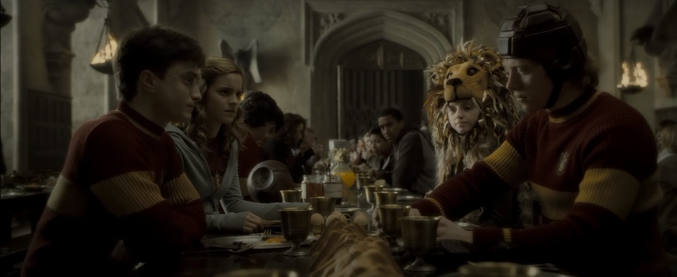 What Half-Blood Prince has in bunches, as much as any Potter movie with the possible exception of Goblet of Fire, is humor. If this is one of the Potter movies you cape for, then how funny it can be has to play a significant role. There’s some good Luna (Evanna Lynch) content here; her star really shines in its ethereal, dorky way in Half-Blood Prince, from physical humor to the charming wispiness of her voice. She wears shoes to bed because she sleepwalks. She tells Harry that he looks “exceptionally ordinary” after she fixes his broken nose, although the real zinger in that little scene is about the very limited differences between toes and noses. Emma Watson doesn’t get a lot of chances to be funny in these movies, but they throw a couple of bones in her direction. There’s her disastrous date with Cormac McLaggen (Freddie Stroma) at a party, for one thing, which puts Hermione, for once, on the wrong foot. “Will you stop eating!” she scolds Ron during the feast; the line about having the emotional range of a teaspoon is better, and if spoken differently probably funnier, but in this picture she can make Hermione’s frustration a little softer. Speaking of Ron, it is a joy to get Rupert Grint’s wonderful line readings back in this movie, as it feels like it’s been ages since we’ve seen him at work. There is an awful lot for him to do at that, featuring a nice little setpiece where Ron houses a love potion intended for Harry and Grint gamely does his best to appear lovesick and confounded. Ron senses something going on between Harry (Radcliffe) and Ginny (Bonnie Wright), and thus finds ways to literally insert himself between them. Rupert Grint is a normal-sized human being, but slipping himself between Radcliffe and Wright, who both top out around 5’5″, makes this all the more amusing. He also gets the line that must have gotten the biggest laugh in theaters. (I feel like I should be able to report on this myself; I was there opening night, but I was like, sort of not at the same time. I had my wisdom teeth out that morning.)