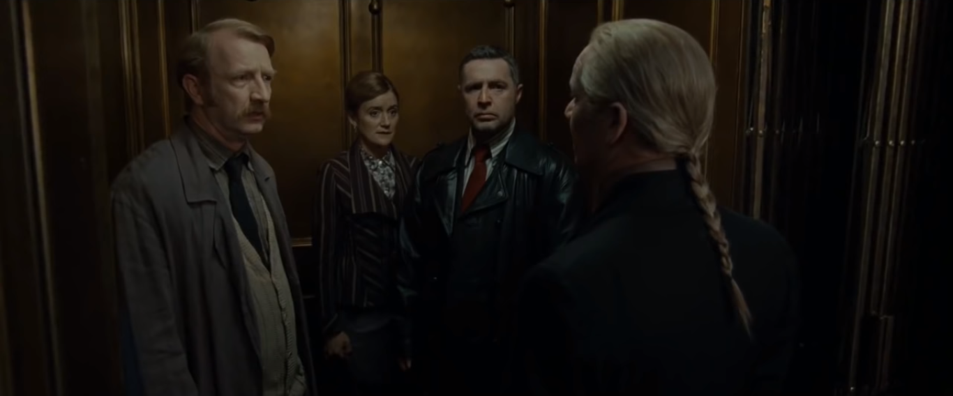 Another type of ending worth discussing in this movie are the sendoffs for a number of characters which, not coincidentally, are the hinges which allow those doors to close. Hedwig is killed in flight, which is very sad not least of which because she is a flying kitty. Mad-Eye Moody (Brendan Gleeson) bites the dust after one last shot of the man on his brilliant reclining broomstick. (That Domnhall Gleeson as Bill reports Mad-Eye’s death makes me wish they’d just given those lines to someone else: what a weird choice.) Rufus Scrimgeour (Bill Nighy, very late to the British actor party), dies offscreen as well, although even in limited scenes, watching the new Prime Minister with the slow voice makes us miss the man a little; his death signals the movement of the Trio from the relative safety of the Burrow to heading out on their own to go Horcrux hunting. Most of all, Dobby’s death is done well. Not only has his presence significantly lightened the movie’s darkest scenes at Malfoy Manor—”Dobby only meant to maim, or severely injure!”—it makes his death all the more moving when it happens. There are an awful lot of people who die for Harry in these movies, as much as people protest that they aren’t dying for him. It’s hard to argue that Dobby doesn’t do just that, and as much good as he’s done, it is painful to watch Harry hold the little martyr in his arms.