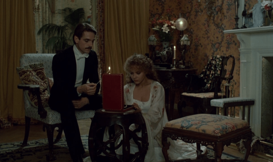 There are not so many different sets in Swann, but the ones we have are opulent, made for people to ogle for their intricacies and surely not for people to actually sit on or lounge about in. Odette’s parlor is lavish, just right for the courtesan to entertain the men who flit in and out, and it gives the sense that one is really meant to go lay about in a different room. It’s no wonder that Charles, who is deeply uncomfortable with the fact that he wants to have sex with her at all, that he wants to give up so much of his life to the pursuit of her, spends a great deal of time in this uncomfortable room. In the shot above, Odette is on the floor, the better to look into the gift box, and Charles sits with his butt just barely on the armchair. Her ability to look comfortable—flowing nightgown, flowing hair—in this formal room is a statement to her skill at her job. In function this little parlor is not unlike the waiting room at the dentist’s, and in effect it appears to cause a similar amount of anxiety in our protagonist as the dentist’s might if he wandered in with a toothache. (There’s a joke in here somewhere about cavities, but I am much too refined to make it.)