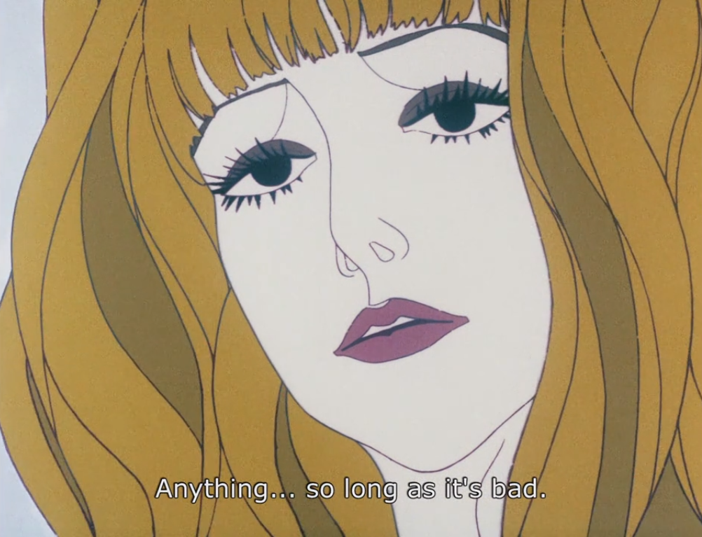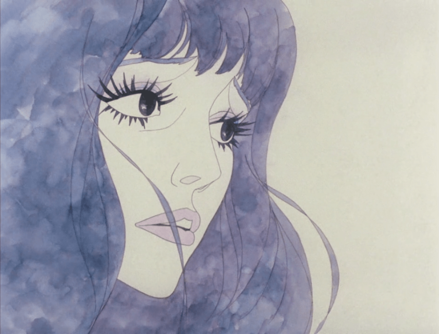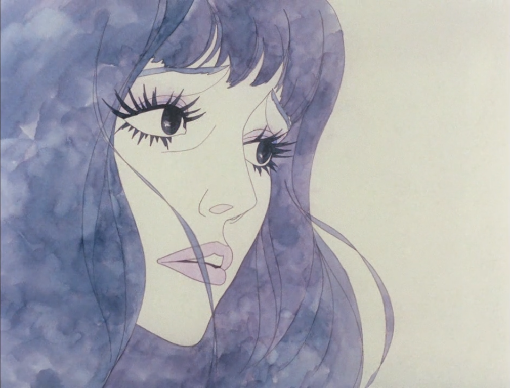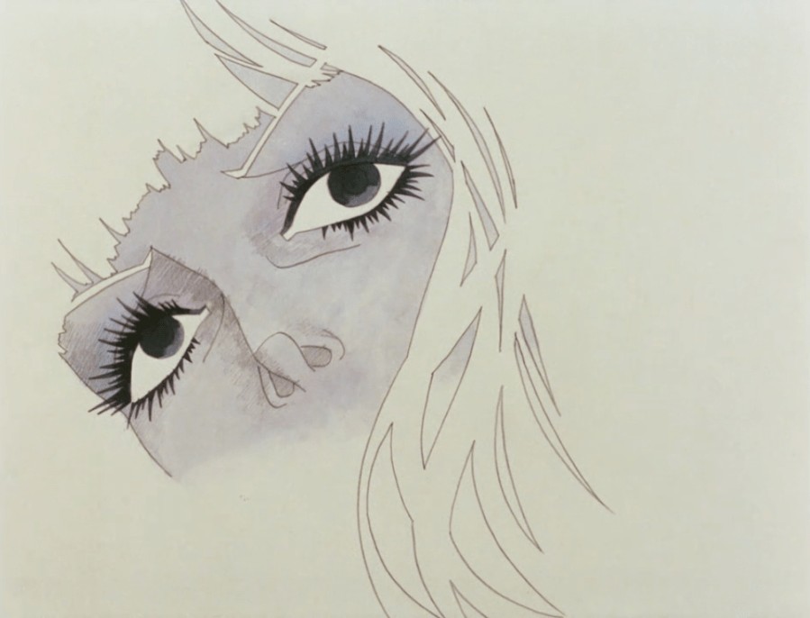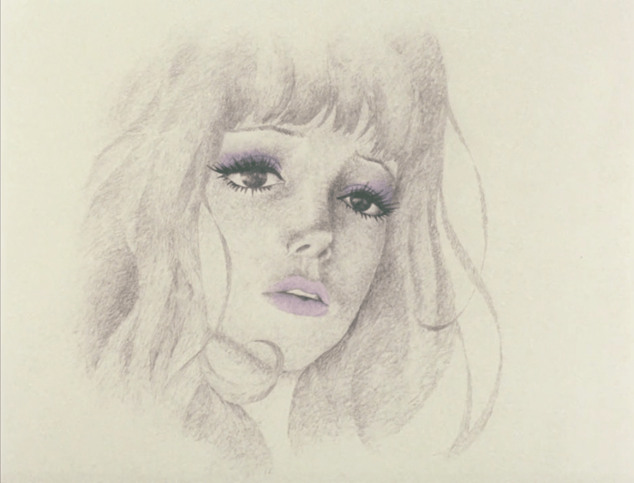 Belladonna, the movie whose characters take the more adventuresome line on sexual activity, is also one of the most radical, strange, and oddly beautiful movies I’ve ever come across. The picture is as comfortable with stills panned across as it is with bonkers strobing as it is with more traditional cel animation. Here are three shots of Jeanne, taken practically at random, which show her in different styles: one a hippie poster (with a decisively anti-peacenik message attached), one an ethereal pencil sketch, the last a smudgy watercolor treatment which is most common throughout the movie: