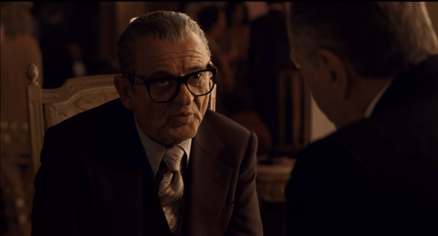 Where The Irishman falls short of Fanny and Alexander—and, to be fair, virtually all movies have and will—is that for all its thematic thundering it lacks the requisite grandeur. This is an exceptional picture, but it lacks the supreme emotional moments which characterize Fanny and Alexander, and of course, the best of Scorsese’s work. What stands out after watching this movie is how straightforward it is. The Irishman is about a man torn between who he loves and who he fears, and, predictably, makes the choice based on who he fears. Frank’s personal loyalty to Hoffa, an affection for him that lasts while he evades the Kennedys, gloats over Jack’s death in public, goes to prison, feuds with a vaguely unhinged Teamster/mobster hybrid, Tony Pro (Stephen Graham), and refuses to recognize that he will only become the head of the union again (to borrow a phrase from a different Scorsese picture) “in the reign of Queen Dick.” All the while, Frank’s warnings for his friend only serve to make him meek, suppliant, nagging. Frank before Jimmy’s jail term was a piss and vinegar guy with the Teamsters’ president; he walked out of a meeting because of Jimmy’s frankly hilarious stream of profanity, only to go back in once Jimmy pleads with him. I didn’t even see you! Jimmy insists. Years later and at his own honorary dinner, cognizant of the danger Jimmy is in, Frank tries to warn him to throttle back, and when he does it, all of the macho aggression Frank used to showcase has gone. He does not know even into the morning of the day he kills Jimmy Hoffa that he’ll do it in the afternoon; he lacks the ability to contravene Russell as much as he lacks the ability to knock sense into Jimmy. The choice, whether or not he realizes it when he’s putting a bullet in the back of Hoffa’s head, is made for him many years before, when Russell intercedes for Frank with Angelo Bruno (Harvey Keitel). He owes Russell his life because he is hasty, pursuing money without the backing of a crime family, a choice which, especially if one knows people in a crime family, appears ludicrously stupid; Russell has interceded for him, has acted as Frank’s defense when Frank was tried in absentia. The movie repeats this idea over and over again. Jimmy will press, Russell will quietly push back, Frank is stuck in the middle. On the whole, this is effective, but it rarely soars, and when it does one is inclined to give the lion’s share of the credit to De Niro’s hurt face, Pacino’s incredibly vulnerable performance, and everything Joe Pesci does. Although the grind of grabbing for power and influence is obvious in Sheeran, I think it is more potent in Hoffa. Pacino understands exactly how exhausted Jimmy Hoffa should be in all of his scenes, how worn down from the “Get Hoffa” squad or how vexed with Tony Pro. On his last day, he is snippy with hitman Sally Bugs (Louis Cancelmi) and unnecessarily expansive about why one should always pack a fish in the car rather than letting it lie on the seat with his foster son, Chuck (Jesse Plemons). His need for other people to be punctual is tyrannical in the beginning, but the less powerful he becomes, the more that feels like a quirk rather than a demand; he waited for forty minutes, he says to Frank. It’s a joke, and Pacino plays it like the joke it is. All the same, though, this is Pesci’s movie.