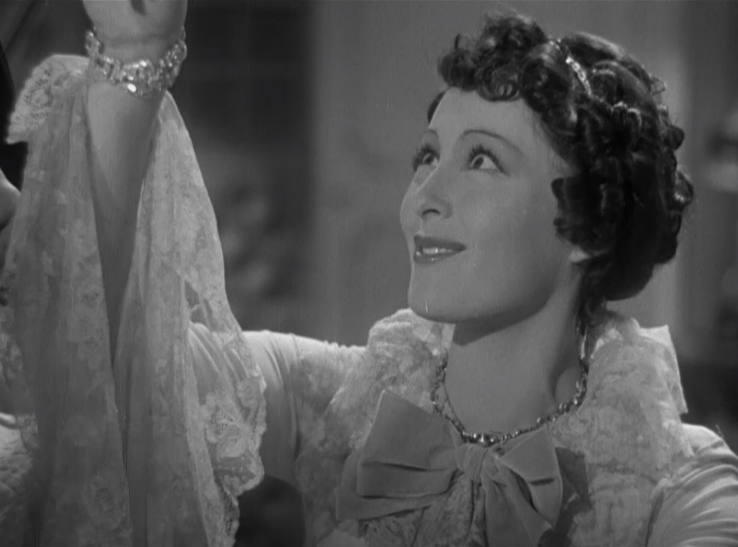 There are performances by the women playing the women in Ziegfeld’s life that stand out much more than Powell’s: Rainer’s Held, Myrna Loy as Billie Burke, Virginia Bruce as the fictional but I suppose necessary negative foil for those two, Audrey Dane. Bruce is good in the movie, although her pretty face and occasional drunkvoice are most of what she needs to get the point across. (Again, if this were a film studies class, perhaps one with a scoop of Richard Dyer, there would be so, so much to write about Dane’s desire to be a star without having to “suffer” for it. Somewhere Lucille LeSeuer and her publicist just arched their eyebrows in tandem.) Rainer plays someone French (see above about Europeans), and she does what she can with a scene which I admire more for its ambition than its execution. Dying of some illness, Held gets on the phone to congratulate Flo for his recent marriage to Burke. She had been married to Ziegfeld before, and suffers through years of him being more interested in his shows than in her; an evening where he tries to scold a drunken Dane looks bad when she walks in on them, and she leaves. She makes a comment on the phone that it’s wonderful that two people can congratulate one another for their successes even after they’ve split. After the conversation ends she begins to weep. All of this, wisely, takes place with the camera focused purely on Rainer. There are no cutaways to Powell, nor do we hear his voice. This scene is emphatically about Held, and although by today’s standards it feels like a lot, it’s nonetheless effective because of how committed Rainer is, her face shining with happiness to speak with her ex-husband once again, and her eyes still sad with the knowledge that she let him go. Loy’s take on Burke is an interesting one. One would expect that as the famous Nora to Powell’s famous Nick, there should be chemistry between them, and there definitely is. It’s surprising that Burke is so domestic, so willing to do what Held could never quite work herself up to: Burke will subduct her professional career to her husband’s professional career with the kind of unquestioning devotion that makes your head spin a little.