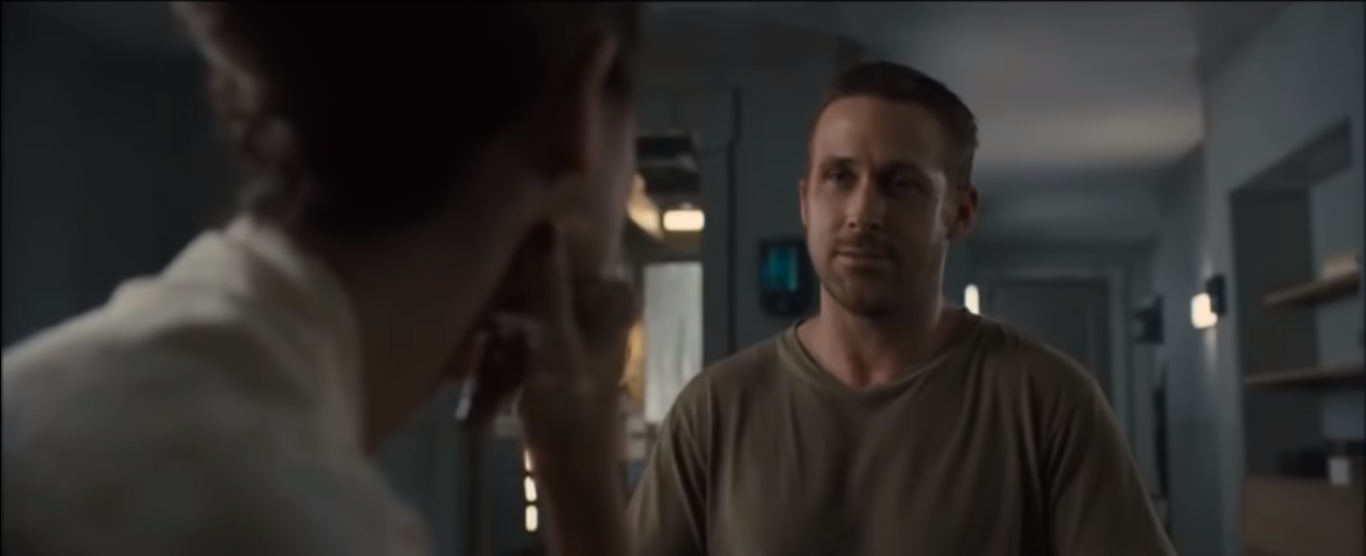 In this movie, as in its forerunner, a replicant tries to fall in love. Roy Batty and Pris have electric chemistry together. Rachael and Deckard, whatever you make of his origins, come via an uneasy path to be devoted to one another. Whether or not replicants have the capacity for love is something that’s left up to us to decide, although I think the film is glad to push towards the affirmative. In BR2049, the thought experiment is altered. K (Gosling), a replicant, has a program called Joi (de Armas) who “lives” in his apartment and whose figure is projected where she might be if she were a flesh-and-blood woman. She certainly acts like a devoted girlfriend is supposed to act (as long as the supposition comes from the mind of the 18-35 year old boy this movie was marketed at), flouncing and smiling and so on. K comes home with a device that allows her to be projected outside his apartment, and she goes outside and feels the rain on her skin, as it were (I know), and she follows him on the missions he goes to. K invites a prostitute up to his apartment so Joi can be projected onto a human body, which sounds deeply weird and which the movie adequately pretends makes a lot of sense. When Joi’s emulator is destroyed, she’s gone, and her last words to K are a hastily spoken “I love you.” Later on, a giant, nude, and pink version of Joi comes down from a building-sized advertisement and flirts with K. He does not react; it’s not his Joi, and we are to take this as a proof that he loved her, not her program. It’s effective, I’d say, at least as far as studying the replicant side of the equation; Her does a better job of wondering whether a program can love back than BR2049 does. All the same, I’ve seen a movie in which we’ve tried to figure out if these near-human beings can genuinely fall in love, and it considers the question deeply and provocatively: it’s called Blade Runner, and it does a better job.