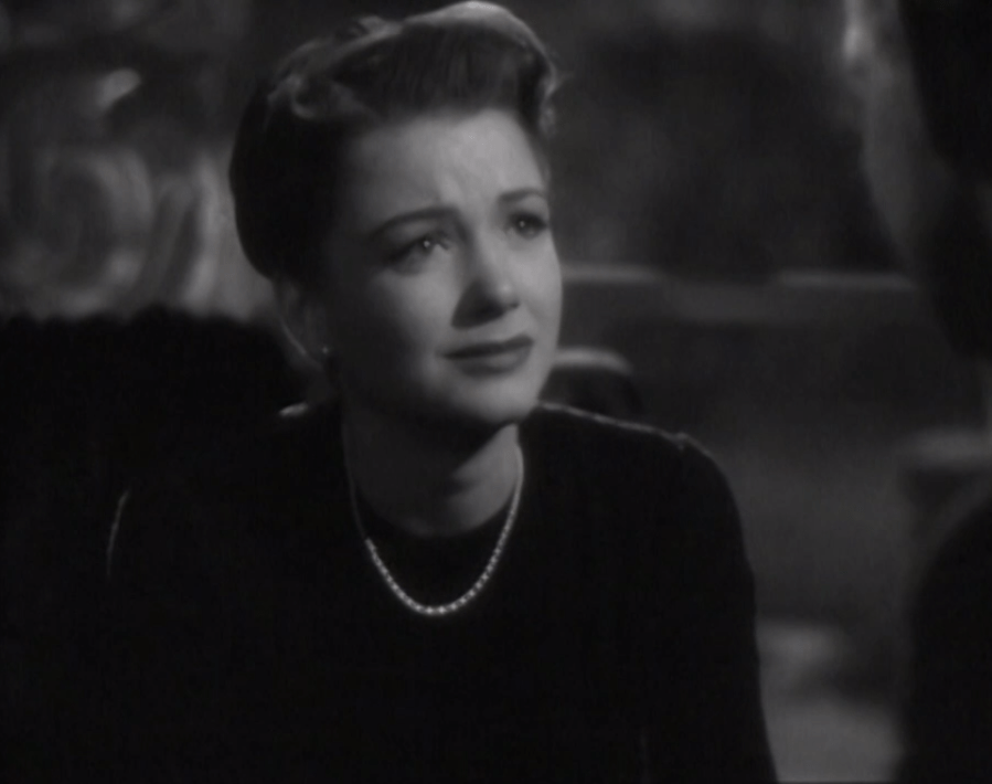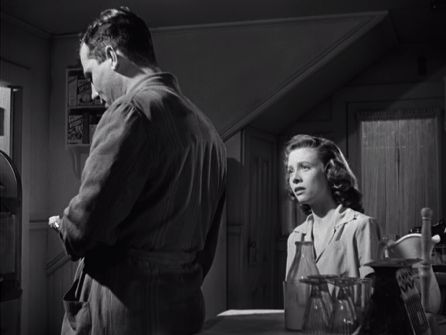 Each of the three wives who receives that letter from Addie—who coyly declines to state which of the men she’s taken up with—at the first opportunity begins to recall the event which might have precipitated an affair. For Rita, she recalls a recent dinner party with her radio boss, scheduled ominously on the night of her husband’s birthday; George (Kirk Douglas) is an intellectual and a schoolteacher, and the first makes him ill-disposed to his wife’s vapid overseer, Mrs. Manleigh (Florence Bates), and the latter chafes at his ’40s masculinity in one of those gems of anthropology one occasionally divines from older pictures. The only bright spot on his birthday is a present from Addie, who has remembered Rita’s husband’s birthday even though Rita has not, and which Mrs. Manleigh breaks. For Lora Mae (Linda Darnell), aside from her presence in the other two wives’ segments, the entire story of her courtship with the brusque and wealthy department store owner Porter Hollingsway (Paul Douglas) is given. The girth of that story in comparison with that of her compeers makes it feel bloated, even if it’s fairly tight as its own subplot; for me the most interesting in a vacuum is what’s happening with George and Rita. But it’s the one with Brad, who out of the six of these people easily the one with the least screentime, and Deborah which is the most relevant to this idea of returning vets.