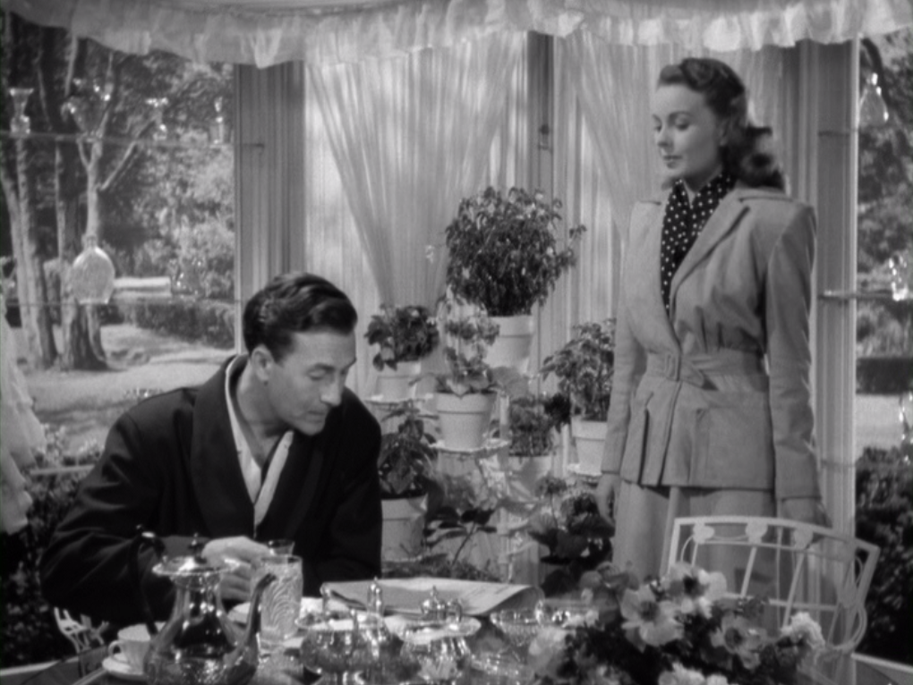 Each of the three wives who receives that letter from Addie—who coyly declines to state which of the men she’s taken up with—at the first opportunity begins to recall the event which might have precipitated an affair. For Rita, she recalls a recent dinner party with her radio boss, scheduled ominously on the night of her husband’s birthday; George (Kirk Douglas) is an intellectual and a schoolteacher, and the first makes him ill-disposed to his wife’s vapid overseer, Mrs. Manleigh (Florence Bates), and the latter chafes at his ’40s masculinity in one of those gems of anthropology one occasionally divines from older pictures. The only bright spot on his birthday is a present from Addie, who has remembered Rita’s husband’s birthday even though Rita has not, and which Mrs. Manleigh breaks. For Lora Mae (Linda Darnell), aside from her presence in the other two wives’ segments, the entire story of her courtship with the brusque and wealthy department store owner Porter Hollingsway (Paul Douglas) is given. The girth of that story in comparison with that of her compeers makes it feel bloated, even if it’s fairly tight as its own subplot; for me the most interesting in a vacuum is what’s happening with George and Rita. But it’s the one with Brad, who out of the six of these people easily the one with the least screentime, and Deborah which is the most relevant to this idea of returning vets.