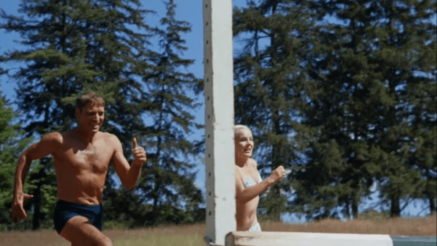 Lancaster, who was fifty-five(!) when this movie came out, is certainly in great shape. He looks like the kind of man who can swim as many lengths as he cares to, which many actors can do. The magic is in the fundamental slightness of Ned’s character. People who are going through a nervous breakdown do not frequently say to themselves, “Golly, I’m having a nervous breakdown,” and Ned is clearly in the throes of one and not thinking about it in the slightest. Lancaster has this way, which I don’t think we’ve seen the like of much, of looking absolutely terrific and acting like a man who is much smaller than that size. It’s impossible to imagine a Dustin Hoffman or Walter Matthau getting away with what Lancaster is getting away with, even though one can imagine both of them playing men who have frankly lost their sense. It’s just as impossible to imagine Clint Eastwood or Bob Mitchum playing this role, even though they would have looked right for the part. There are a handful of loose contemporaries who could have done something in the neighborhood of what Lancaster’s doing—Richard Burton, Robert Ryan, William Holden, maybe Steve McQueen—but for the most part I don’t even think that august group of actors could have been in a situation that humiliating for so long. Lancaster’s tremendous gift as an actor was this ability to embrace a character’s shame, to be accepting of the weirdness in him, but to look like a million bucks. At his best, it’s what George Clooney tries to do; Brad Pitt has been chasing this particular lure his entire career and has never quite pulled it off. The Swimmer only works, I think, because Lancaster wills it to working. I think about his blue-eyed close-ups, the way his body looks when he runs, the game smile he’s got across his face as he hurdles the jumps made for horses, the confusion in his face when people press the reality of his situation on him and the vague mania of greeting old pals who don’t remind him of the past. The part of the movie where he describes his plan to “swim home” through his neighbors’ pools is fine for what it is; it’s the way he walks around those almost universally crowded swimming pools, scoping them out before he dives badly into each one, that makes this nut believable. And quite sad, too.