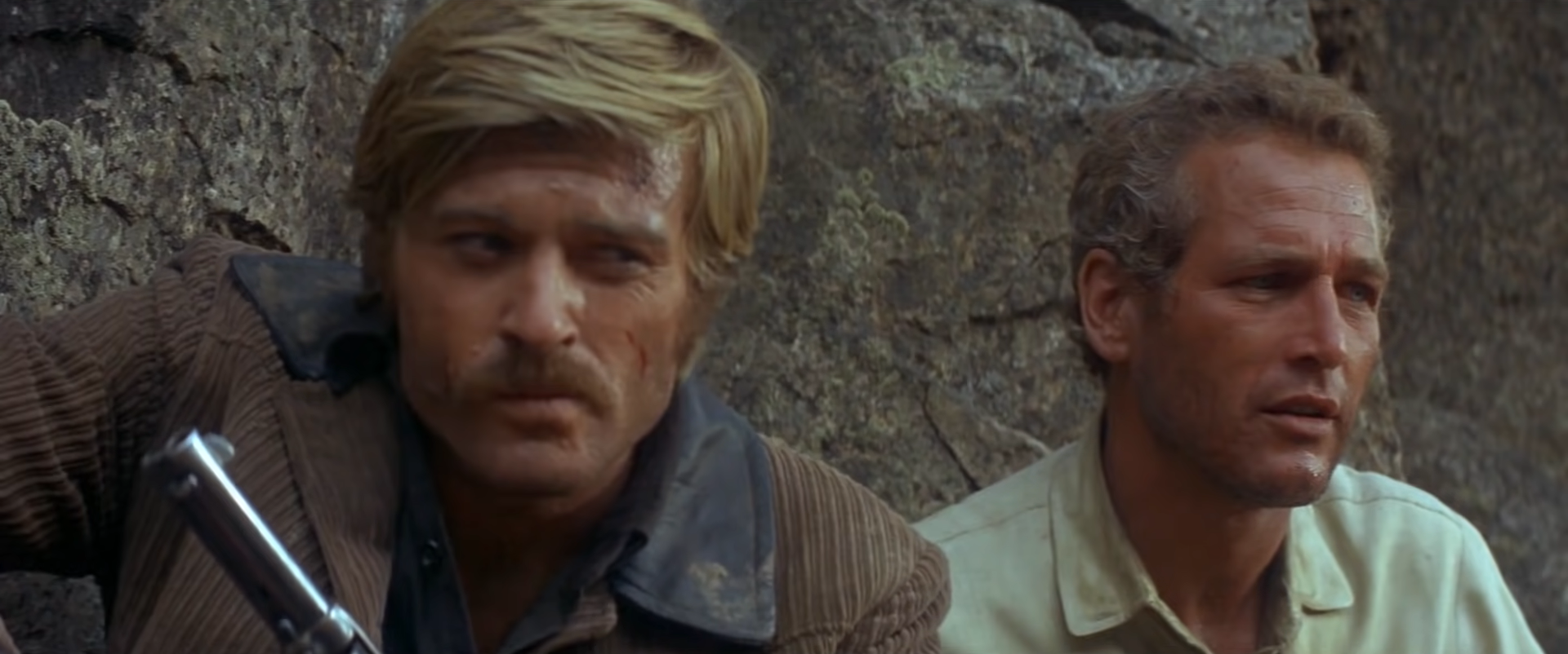 Is that what you call running? Is that what you call giving cover? falls short because we’ve heard what the good banter in this movie looks like. It doesn’t quite have the same feeling to it as that delightful scene where Butch and Sundance do a Peter Pan, to borrow from another movie about a manhunt. I’m willing to believe any hagiography about William Goldman after that incredible punchline. Trapped on rocks above a pretty busy river, at their wits’ end after failing to shake a posse, Butch comes up with a plan. We’ll jump, because they will not follow us in doing anything as crazy as that. This goes back and forth a second until Sundance provides his rationale for wanting to stand and fight: he can’t swim. Butch guffaws. “You crazy,” he says, “the fall will probably kill you!” The two of them run off the cliff, screaming the whole way, but it works out for them in a way that none of their half-dozen other gambits did. It works for us watching too. The jump, compared to like, Harrison Ford’s Peter Pan, is not much of a jump, but that part hardly matters when it’s preceded with that bleak, hilarious witticism. For two soldiers of fortune such as Robert Leroy Parker and Harry Longabaugh, “the fall will probably kill you” is branded on their haunches. Every risk they take is not much of a risk at all, considering that they’ve chosen a lifestyle which provides big payoffs and which everyone has to know will end in a hail of bullets.