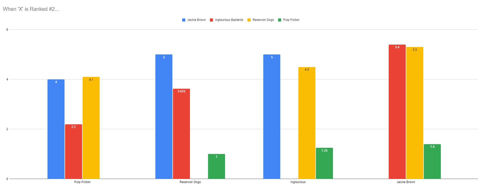 What stands out to me is the difference between Jackie Brown and the two movies immediately above it on this list. When Inglourious Basterds or Reservoir Dogs comes second, Jackie Brown has a lower average than either one of the remainders. When Pulp Fiction is second, the most likely film to come first is Inglourious Basterds—on other meta-analyses, a 2.2 average is typically good enough to be the top-ranked movie—and then it’s basically a dead heat between Jackie Brown and Reservoir Dogs for the next spot. But when Jackie Brown is in the 2-spot, not only does Pulp Fiction have its lowest score (though it’s still an overwhelming choice for #1), but the scores for the two other second-placers are lower than in any other scenario.