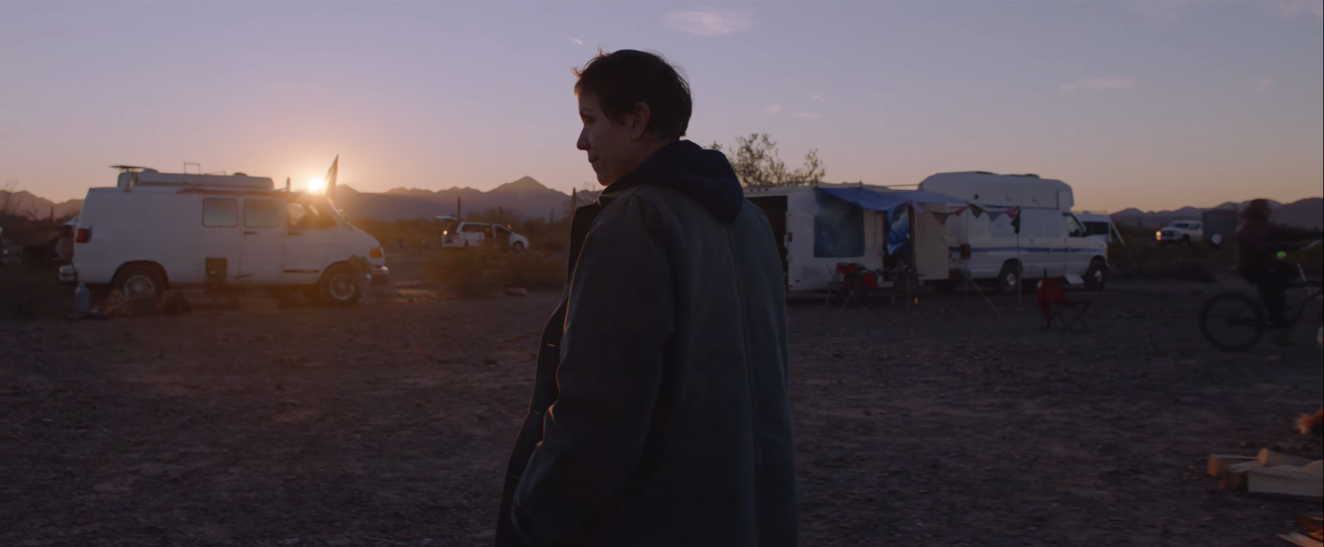 If there’s one Best Picture winner that Nomadland has been compared to most frequently, it’s Moonlight. A slightly unusual, incident-driven story structure broken more neatly into chapters than acts. Auteurs of color. Cinematography that people went gaga for. Unexpected performances from unknown, perhaps even nonprofessional actors. A sense of realism that pervades the film, even if the events are fictional. Better received on the increasingly essential festival circuit than it was, or would be, in theaters, and with that comes an intimation of a smaller movie, a more personal movie. What Nomadland is missing is a political attitude, a charge that I would never toss in Moonlight’s direction, and perhaps why we went into Oscars Season 2020 with Nomadland as the smart money and Moonlight would have been an upset no matter how few times they lost the envelope for Best Picture. I think it’s not such a stretch, though, to say that it bears a similarity to a movie like Green Book, a movie which is about true events that the average person no normal person is privy to. In other words, it is the kind of fiction that can be most easily given authenticity and thus weight in the mind of your average viewer: “based on a true story.” Though Fern is no more real than Marge Gunderson, the story of these real vandwellers, the real Empire, Nevada, the real Bob Wells and Linda May can be enough to cast this movie with seriousness. The idea of a real Tony Lip and a real Don Shirley teaching each other how to relate to someone unlike themselves—even if, especially if, that story is basically hooey—gives that story seriousness. Viggo Mortensen could have housed ten pizzas in bed and it would have maintained that seriousness; heck, the pizza and the fried chicken and the wild accent work are what make the serious parts stand out in the first place. Fern getting the squirts in her bucket accomplishes much the same thing as Viggo putting basically a whole pizza in his mouth at once. It’s so out there and weird and memeable that when it comes time for them to do the Serious Stuff, you’re at attention. You know it’s different enough that you like, stop smiling blandly and start furrowing your brow on cue.