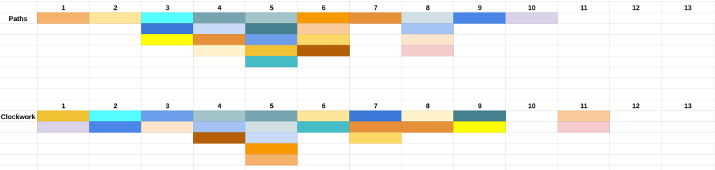 To be honest, not my best hypothesis. (I’ve included the sums for each to go with the rest of the chart, so if you’re wondering why the little boldface numbers are there, that’s why. It was close!) I was literally right that Clockwork hit every spot, and I was right that Paths gets most of its strength from that 4-6 range. The difference between them, even more than the people who have Clockwork eleventh, is how many people have Paths of Glory sixth.