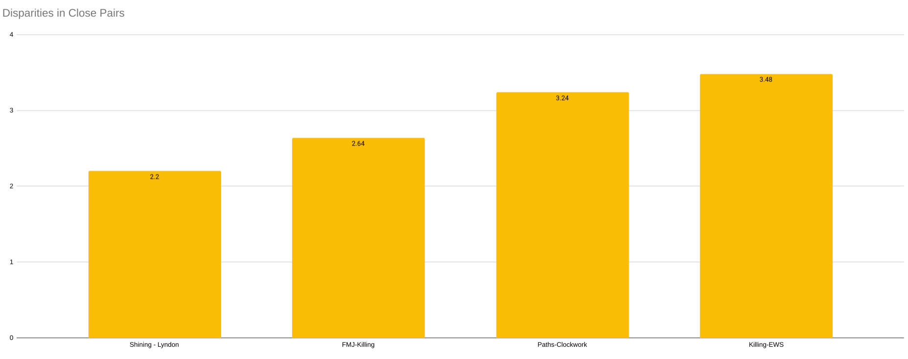 I was curious to see if this was the pair of films, at least from movies that weren’t sitting in at the bottom, which had the greatest gaps between individual listmakers. In other words, if someone ranked Paths of Glory highly, say, did that imply that A Clockwork Orange tended to be lower on their list? I pulled four pairs of consecutive movies which were pretty close to one another by the averages, and the only average distance that was greater than the Paths-Clockwork disparity was the Killing-Eyes Wide Shut disparity. It certainly looks like an affinity for one means less of an affinity for the other. (Basic as I am, that appears to be the case with me as well; that average disparity of 3.24 spots matches my own gap between Paths and Clockwork pretty neatly.)