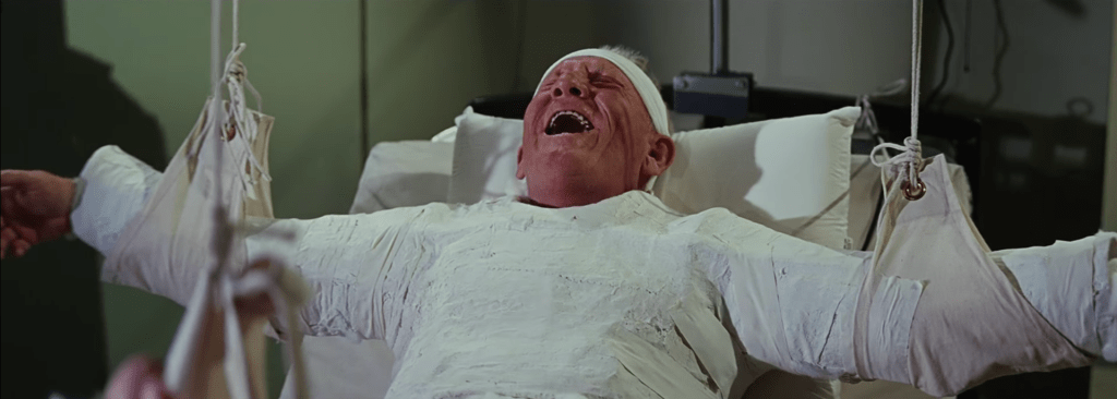 All the same, it’s the grandfatherly mode that has really persisted for the prematurely white-haired Tracy, and why argue with fate. In It’s a Mad, Mad, Mad, Mad World, he is as natural as ever, perhaps even a little too natural. Culpeper, who has been watching the farce of a great many people scurry around southern California in search of buried treasure, finds in the middle of the action that he’s getting a raw deal. Seeing an opportunity to get his pension back and more, he decides to enter into the fray himself. Part of it is Tracy’s relative infirmity compared to younger costars like Jonathan Winters or Sid Caesar or what have you, but in this crowd primarily built from television maniacs, he just seems a little more normal. Even the consequences he’ll face offscreen hew far more towards realistic rather than goofy. He predicts, in traction as much as the next guy thanks to being flung off a fire truck’s ladder, that as the public-facing official and responsible citizen among this group of weak-minded wackos, that a prison sentence awaits him along with his divorce. It’s the voice we’ve heard so often from Spencer Tracy before, that knowing, gruff voice which is instantly recognizable as his. The laugh at the end of the picture is a little strange, but given how much harder everyone else in the room screams at Ethel Merman’s banana pratfall, it’s still appropriate. It’s the most natural laugh of anyone in the room.