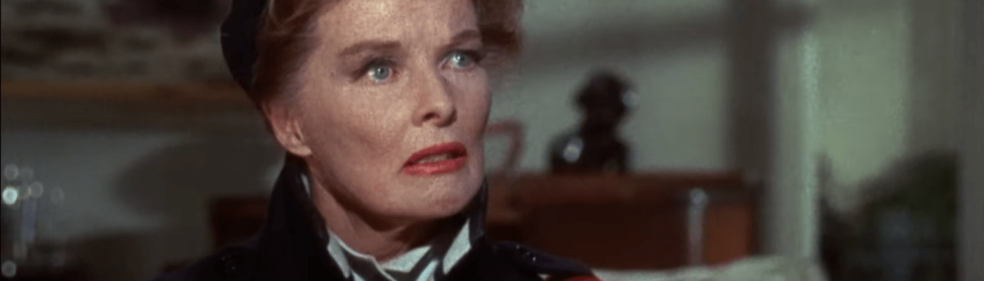 Maybe it’s not so surprising, with that thought in mind, that she had a late-career renaissance. We don’t get to talk about her work in The Lion in Winter opposite Peter O’Toole because it’s British, but that leaves a number of films where she played someone’s wife. Hepburn as the wife who is better than her husband, even if she’s flawed herself, is who we come back to over and over again from the 1960s on. All three of her Oscar-winning roles from that period—Christina Drayton of Guess Who’s Coming to Dinner, Eleanor of Aquitaine in The Lion in Winter, and Ethel Thayer in On Golden Pond—are mothers, but their motherhood is secondary in those pictures just as Hepburn was personally disinterested in having children. It’s the relationship with her husband that matters most. Guess Who’s Coming is a showcase for a dying Spencer Tracy and an entirely alive Sidney Poitier, but as the wife who comes to the moral decision well before her husband does, Hepburn gets to play that moral center she was always so good at playing even at the expense of pure wattage. The same is true in On Golden Pond, which is not much of a picture on its own but stands as a delightful showcase for old, cantankerous Hank Fonda. Once again, Hepburn plays the supportive wife with a better ear for her heart than her husband; once again, she makes a part which could not be much on the page and makes it indelible. The grace that one could not imagine in Alice mixed with the gentleness one finds in Mary are both present in Christina and Ethel. Hepburn is a better actor at this point in her career (perhaps peaking in an earlier British movie, Summertime), but the image has also changed. There’s maturation in the star image, if not necessarily in the woman behind it. My favorite film of hers that she’s in after 1960 is Long Day’s Journey into Night, an adaptation of the Eugene O’Neill play which maintains the unsparing bleakness of the original text. Long Day’s Journey culminates with Mary Tyrone, by now relapsed into a morphine habit which puts her on much the same basis as her alcoholic family, coming downstairs and speaking quietly in the mind of her younger self. The film ends with the men of her family looking at her (or, in the case of Dean Stockwell, looking down and away, unable to meet the intensity of her brokenness), speechless. Thus Hepburn at her best.
