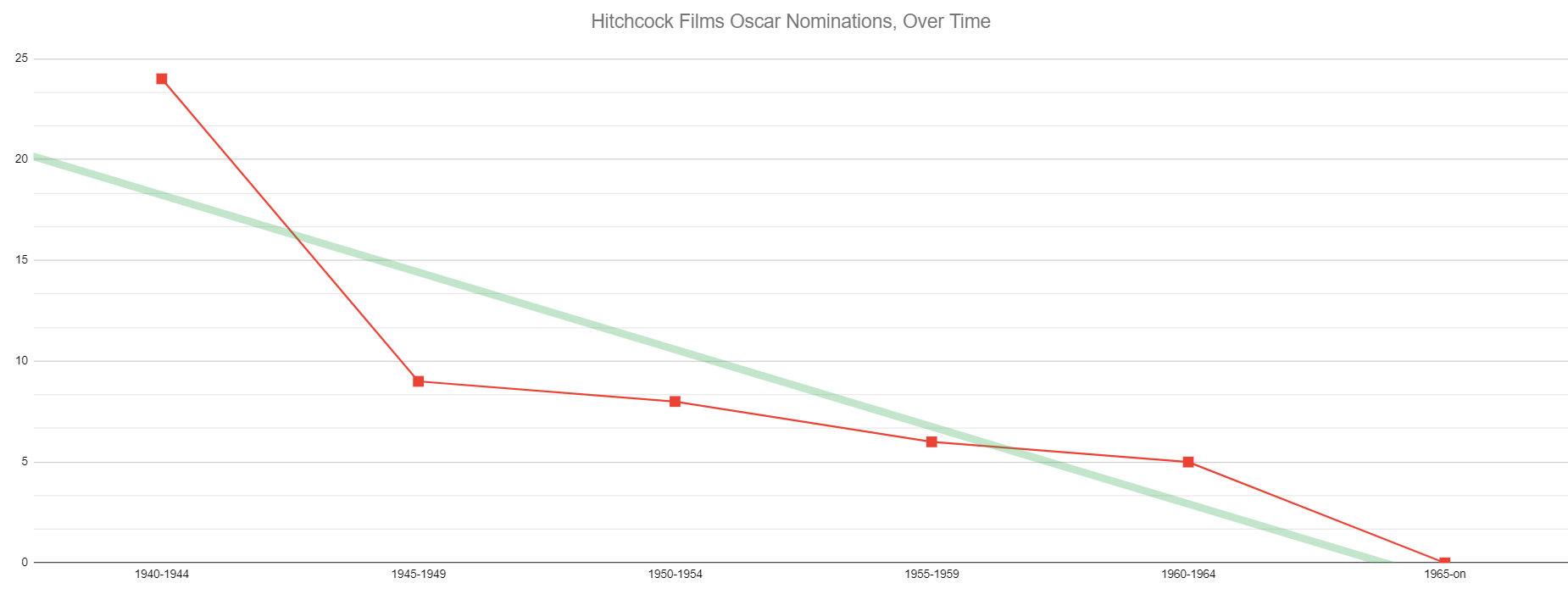 All of the wins come between 1940 and 1956, and it’s the first movie of his that was nominated for Oscars, Rebecca, which earned the most nominations as well as the aforementioned Best Picture. I had no idea that Foreign Correspondent, which is also a 1940 release, was tied with Spellbound for the second-most nominations for a Hitchcock movie, with six apiece. (Incidentally, this is an incredible trivia question to stump your cinephile buddies with.) I think you can sort of see the decline over time here, but it’s much starker in the chart below, with trendline.