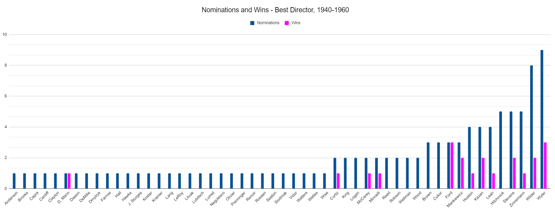 Hitchcock got his first Best Director nomination for 1940, and his last for 1960. The Oscars weren’t in the habit of rewarding British films in the 1930s, when Hitchcock was most active there, and to be perfectly frank I’m not sure that there was a Hitchcock movie after Psycho which stands out as an obvious missed opportunity to give the man his Best Director award. In any event, there’s a pleasant kind of round-number symmetry in there, and it got me thinking about who the most nominated and most winning directors of that period were. You can see the chart below to find both: