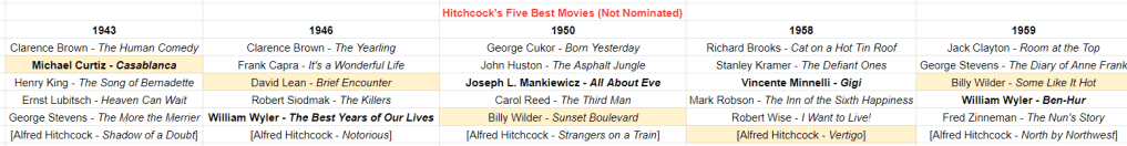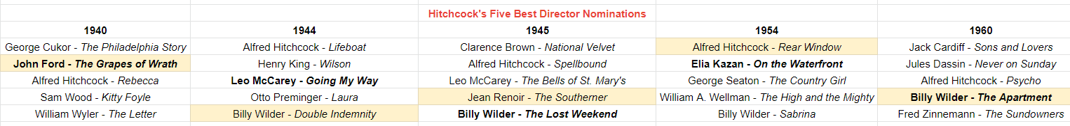 In the chart below, you’ll see that I’ve bolded the actual winner of the award for that ceremony, and I’ve highlighted the person who I thought should have won for that year (I know, bad me, biased me). These are the five years that Hitchcock was actually nominated for the prize: